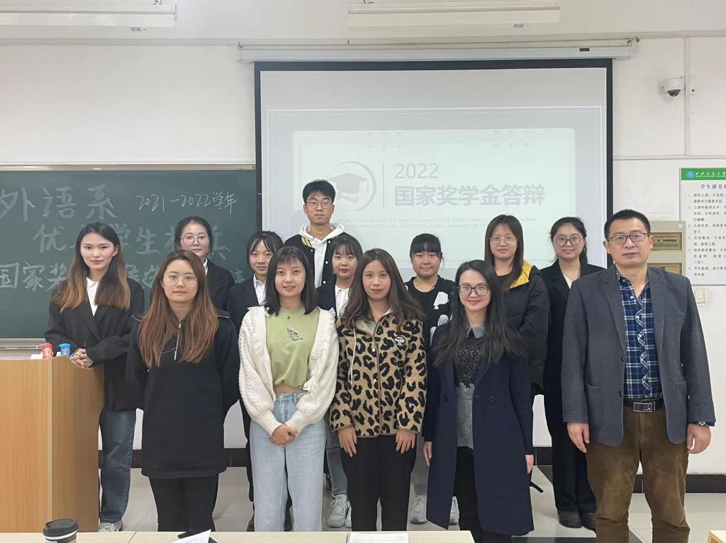 为全面落实评选学院优秀学生标兵和国家奖学金公平公正公开的程序,依据学院资助中心关于国家奖学金评选文件的通知,经过学生自主申请、系内初审,外语系于2022年10月7日在教学楼B316举办优秀学生标兵候选人答辩会,本次答辩的评审委员由外语系主任助理吴夫迎,英语教研室张一帆、付渝,学工负责人关天骄,辅导员韩蓉五名老师组成,大二至大四共有8名学生参加答辩,各年级优秀学生代表10人观摩、学习。