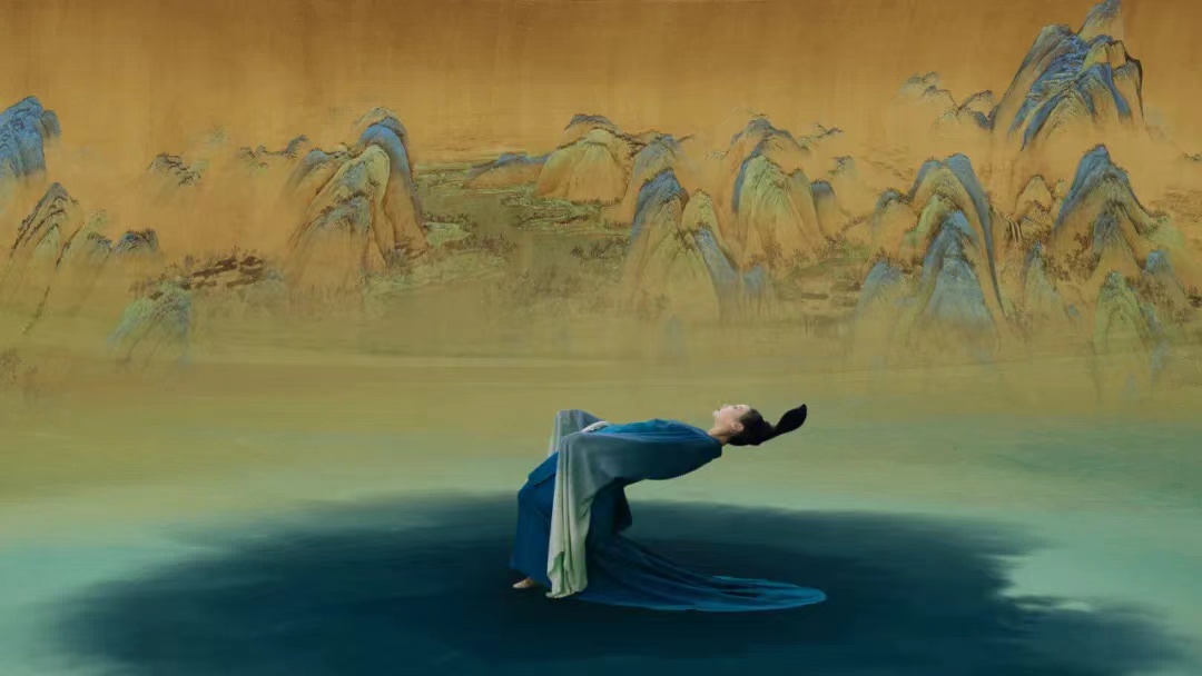 丁金具体负责视频开篇《只此青绿》领舞孟庆旸的舞蹈背景部分的动画,主要使用了C4D做场景、摄像机反求和渲染,用AE做贴图。