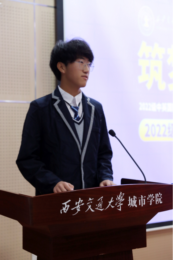 2022级金融国际班赵洹增做新生代表发言,他讲到从拿到录取通知书到初入大学,再到如今投入到忙碌的学业,内心经历了由胆小、放不开到现在的自如、享受城院,他很感激当时做出选择国际班的决定,也希望通过三年的学习实现自己的目标,为城院增光添彩。