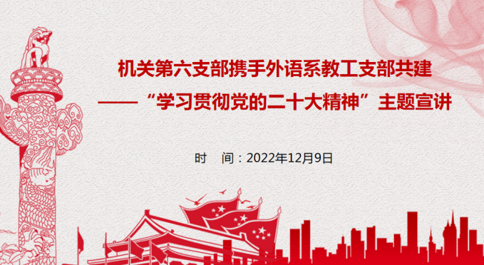 为持续深入学习贯彻党的二十大精神,12月9日下午,机关第六党支部、外语系教工及学生支部共同在线上召开学习贯彻党的二十大精神宣讲报告会。本次报告会邀请思想政治理论教学部鱼晓辉主讲,会议由机关第六党支部书记黄迎主持。
