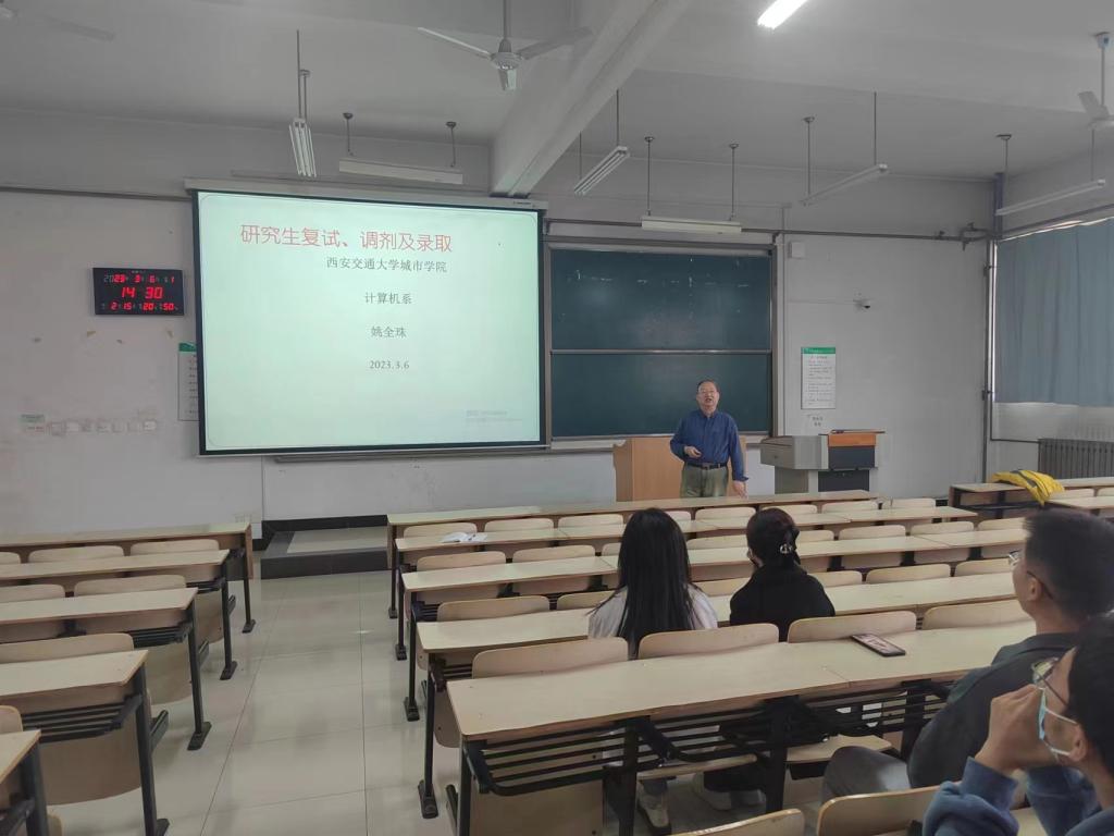 为帮助计算机系2023届考研学生顺利完成研究生复试与调剂,提高计算机系考研录取率,3月6日下午计算机系在E100教室举行2023届考研复试指导交流会,系主任姚全珠教授担任主讲,学工办刘敏涛、来涛和考研学生参会。