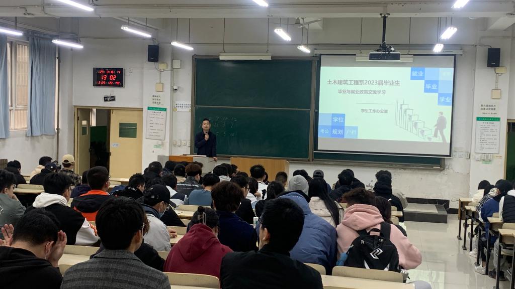 为进一步推进2023届毕业生就业教育与引导工作,帮助和服务毕业生顺利、尽早地就业,在总结前期工作和分析研判现阶段形势的基础上,土木建筑工程系于3月16日中午在C100教室举行了毕业生毕业与就业政策交流学习活动。系副主任、建环专业负责人康彦青,系主任助理、土木工程专业负责人黎莹,系主任助理、学生工作负责人牛彦龙与部分毕业生一起参加了学习和交流。