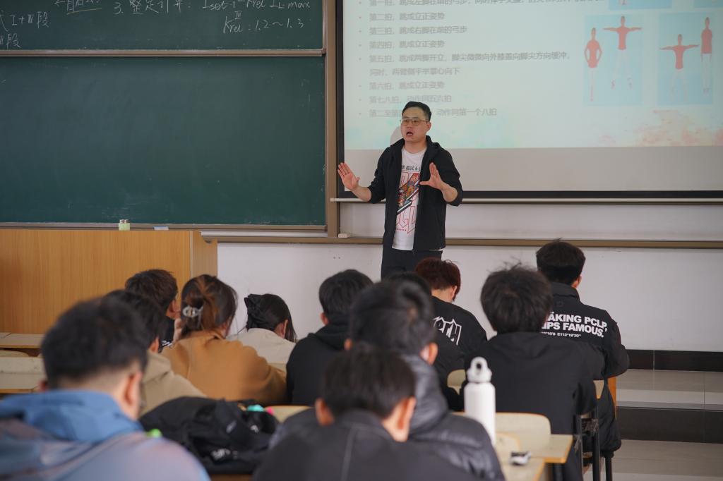 指导老师李严老师在培训中向同学们讲解了比赛细则、动作要领及扣分点。李严老师希望通过上一届学生教学下一届的方式,不断的弥补不足,提高训练质量,期待在本届运动会上同学们能散发出更耀眼的光彩。