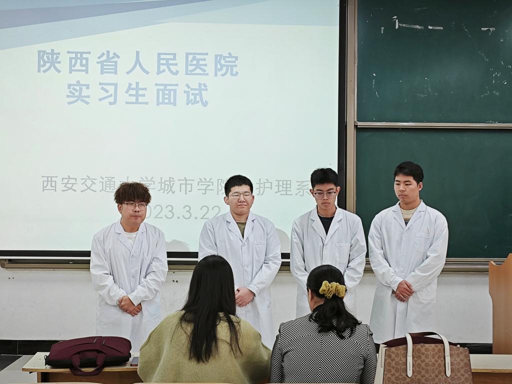 为保证实习生选拔工作顺利进行,护理系学工办前期积极组织学生进行实习点报名、面试培训、模拟面试等工作,共有2020级24名同学参加了本次选拔。面试环节中,学生按照5人一组进行面试,每位同学依次进行自我介绍,主要包括个人基本信息,在校学业情况、获奖情况等相关内容;同时,陕西省人民医院的两位老师针对同学们的专业知识和面试情况进行重点考察。