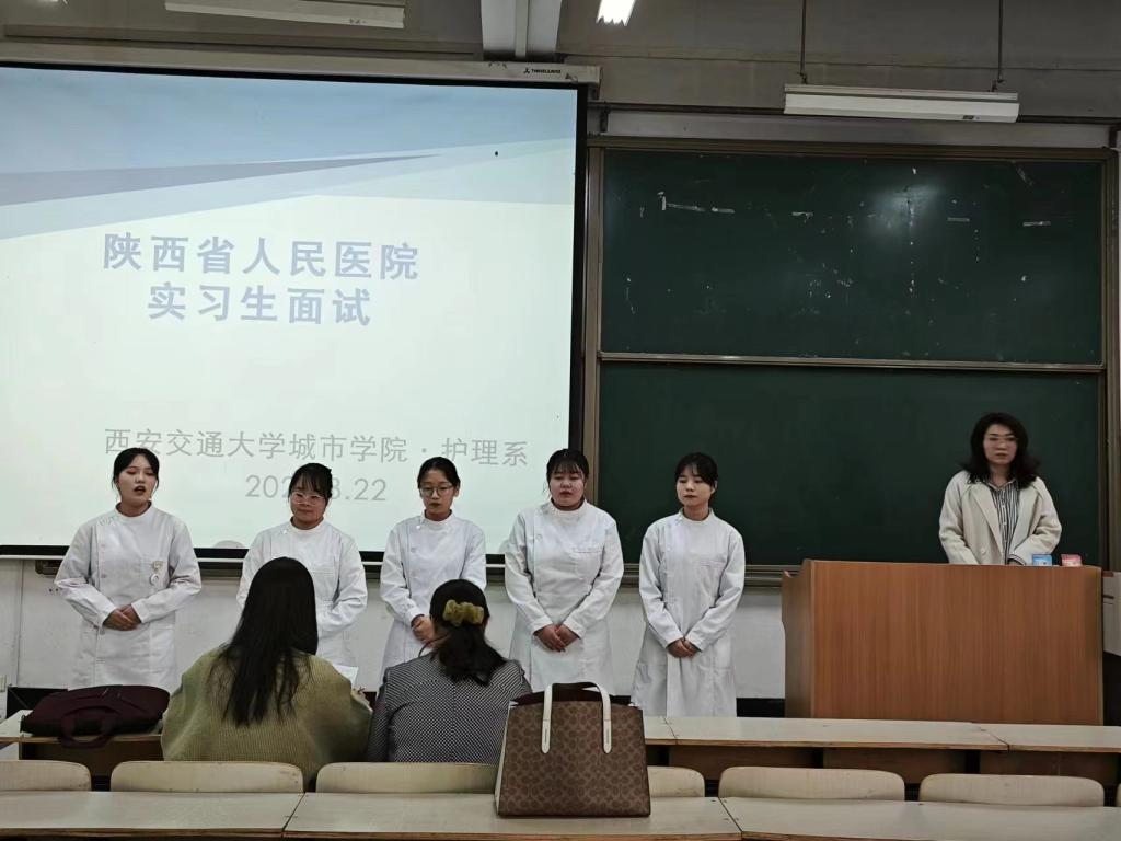 为了扎实推进2020级护理学专业学生实习工作,威尼斯7798cc护理系开展陕西省人民医院实习生选拔工作,此次选拔采用线下面试的方式开展,由陕西省人民医院护理部副主任刘晓梅,护理部郭花老师担任评委。护理系常务副主任王梅芳、主任助理李楠、学生工作主管王娇丹、学工办游晨阳子、黄菲菲参与本次面试。本次面试由王娇丹主持。