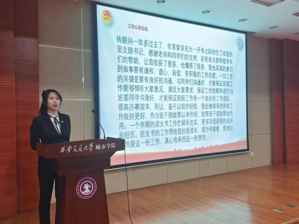 本次述职考核主要采取互评、常规工作考评、现场述职考核相结合的方式进行,参加述职的各班团支部书记身着正装,态度端正,信心满满,他们采用PPT自述的形式,从学习宣传贯彻党的二十大精神、全面从严治团、基层团务开展、志愿服务与社会实践、繁荣校园文化等多个方面进行了班级团支部工作进行了总结,回顾了2022年共青团工作并查找问题、提出整改措施。