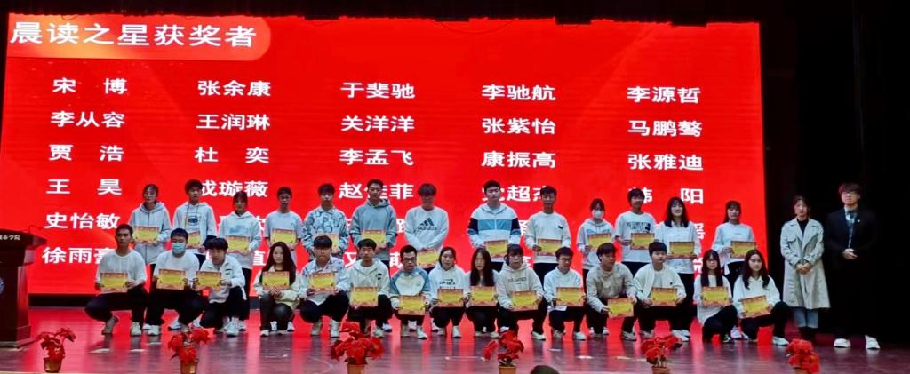 软件191班卓尼娜同学作为优秀朋辈代表发言,她结合自身经历,分享了学习经验和方法,并强调大学中定位自己的重要性,要有自律意识,确定目标之后制定相应的计划,善用科学的学习方法,提高学习效率,用恒心与信心铸就自己的梦想之路。接着,计算机国际2201班谷梓萌同学分享了获得“优秀笔记”的心得。她表示做笔记的目的在于把课堂上老师讲授的知识变成自己的知识,从对而不熟,熟而不巧,最后达到熟能生巧。她呼吁同学们认真做好课堂笔记及读书笔记,在做笔记的同时收获知识、启迪思想,利用笔记加深学习记忆,成就更好的自己。最后一位分享者是“晨读之星”获得者艾庆凯同学,他指出养成一个好习惯需要21天,如果能坚持重复21天以上,就会形成习惯,成功就是简单的事情重复做。他也希望同学们能继续坚持,充分利用早读时间加强英语学习,不负晨光。