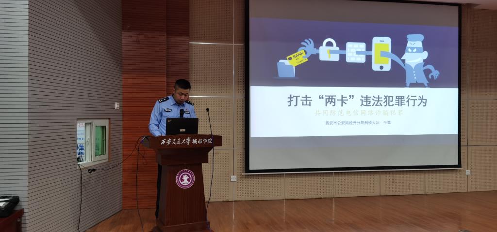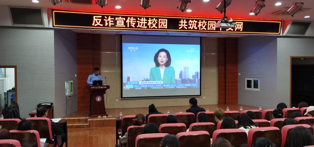 此次主题教育由公安西安经开分局反诈中心民警仝鑫同志主讲。讲座主题内容围绕打击“两卡(电话卡、银行卡)”违法犯罪行为、共同防范电信网络诈骗犯罪展开,仝警官针对大学生这一特殊群体结合当前全国典型案例细致解读电信诈骗的概念、高发类型及防范要领;并结合大学生日常生活交往、就业求职经常遇见的骗局剖析真实视频资料,揭露犯罪分子的伎俩,呼吁师生时刻擦亮眼睛识破骗局,提高自我防骗意识和能力;同时,希望广大师生能争当志愿反诈宣传员,为社会、为学校为他人伸去援手、提供帮助。