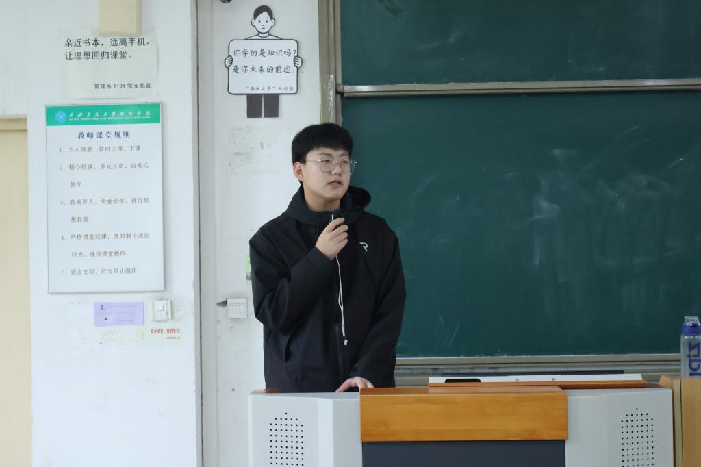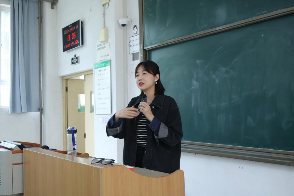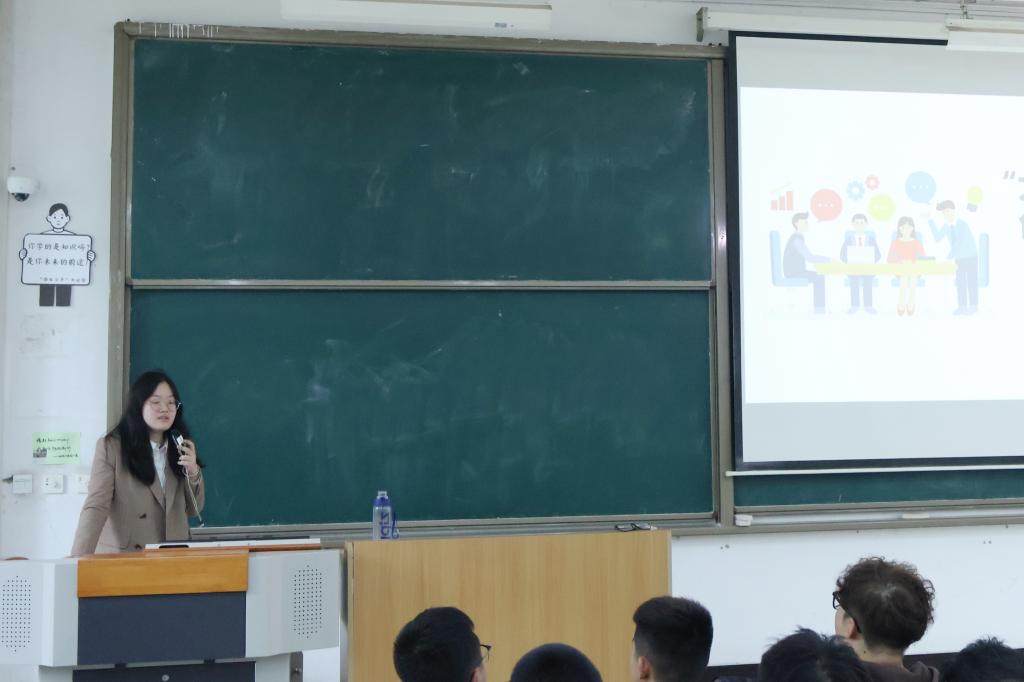 孙菡忆从大广赛的基本情况、命题解析、作品类别、参赛须知以及往届获奖情况五个方面为同学们进行了全面的赛事介绍。她希望同学们在备赛过程中一方面要重视与参赛团队组织协作,尽可能发散思维,碰撞出创意火花。同时公布了所有指导教师可指导的参赛类型与详细联系方式,希望同学们重视与指导老师的沟通交流,汲取老师的建议,对作品不断调整打磨。最后鼓励同学们多关注冷门品牌、新品牌,另辟蹊径找到最适合自己的赛道。