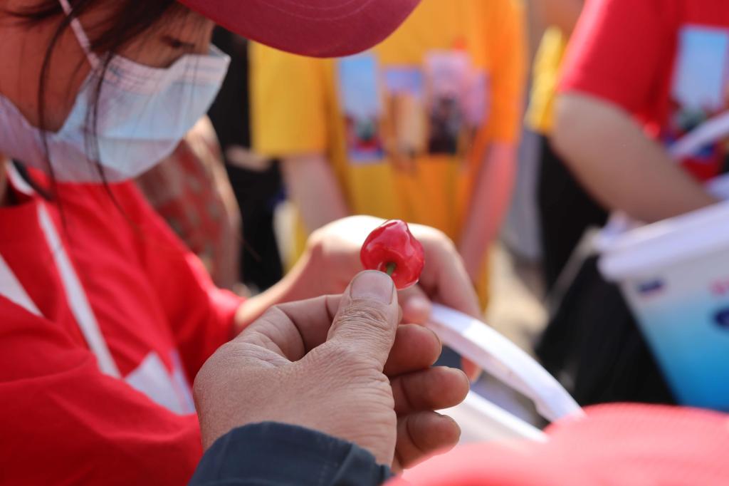 在挂满枝头的樱桃树下,弥漫着浓郁的果香,队员们娴熟地用采摘工具将一颗颗胀鼓鼓、圆溜溜的樱桃放入篮中。随后,队员们在“水果仁者”抖音直播间活力开播。
