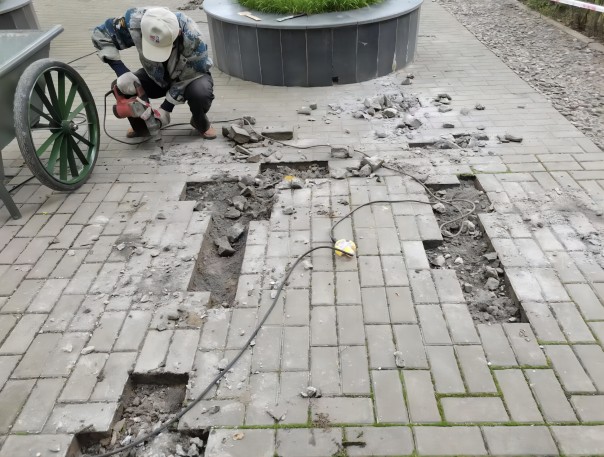 学院中心广场道路由于使用年限较长,多处出现松动、变形等情况,特别是雨雪天,给学院师生出行带来了不便和诸多安全隐患,条保部组织维修人员对此区域地砖进行了更换修复工作,确保师生出行安全。