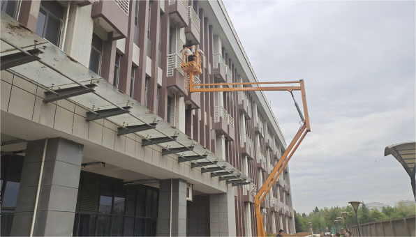 学院现有建筑物,投入使用已有十多年,部分外墙墙砖出现老化、脱落现象,为预防师生上下课发生不安全事故,近期,条保部对存在安全隐患的建筑物进行了全面的安全排查,并组织工作人员对外墙空鼓、快掉落的瓷片进行逐一清理,保证正常教学和生活的开展。
