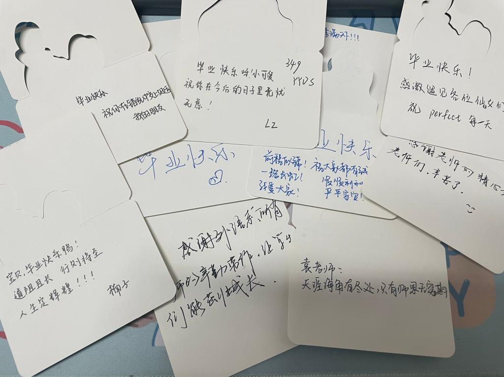 四年前同学们怀着彩色梦想走进了威尼斯7798cc,四年中有过欢笑,流过泪水,经历磨炼,得到成长。会议伊始,同学们观看视频再一次重温大学生活的精彩瞬间,视频结尾彩蛋时刻,学生会同学准备了老师们对毕业生的祝福视频,同学们热泪盈眶,沉浸在温馨时刻里。随后,胡婷作为教师代表发言,对即将开启新的人生旅程的毕业生们表达了殷切期望和真挚的祝福。优秀学生代表陈欣乐,以自己大学四年的成长经历与各位毕业生共勉,希望大家在完成毕业答辩同时,做好日后“人生答辩”的准备。为树立先锋模范,会议第四项表彰优秀毕业生干部、优秀毕业生及考研先锋,同学们纷纷对以上同学表示祝贺。一首《推开世界的门》表达了低年级学生们对学长学姐们的不舍与眷恋之情,2020级学生代表徐高一铭、李一铭、刘甲、杜伊洁四名同学为毕业生送上了诚挚的祝福。会议最后,毕业生写下对母校、老师、同学想说的话,与美好的大学生活做最后的道别。