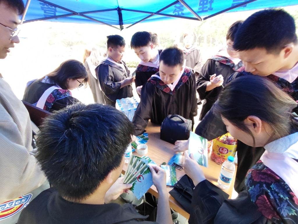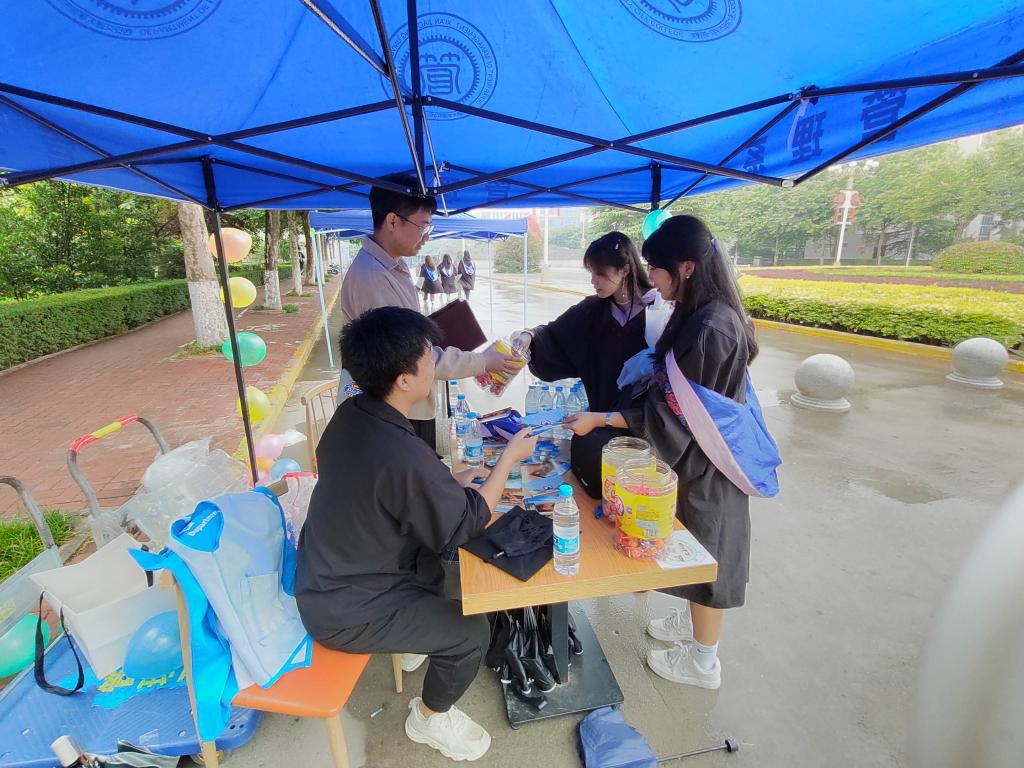 5月25日,管理系在毕业照拍摄点附近搭上了专属帐篷,拍完毕业照后,毕业生可去帐篷内领取一根棒棒糖和一张车票,随后邀请自己四年中最喜欢的老师为专属检票人,在车票上签署姓名,并以此来纪念大学的最后一程。