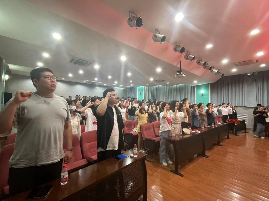 大会在庄严的国歌声中拉开帷幕,姚老师宣读了学院大学生党总支“七一”评优表彰决定,与会领导老师为37名优秀入党积极分子、28名优秀学生党员、7名优秀党务工作者及3个先进基层党支部进行了颁奖表彰。学生党员代表吴伊在发言中表态,要不断提升党性修养,拼搏努力、知行合一。在秦锦鹏同学的带领下,全体党员庄严肃立,紧握右拳,重温入党誓词。一句句铿锵有力的誓言回荡在报告厅里,让人鼓舞振奋、坚定初心。最后,党总支书记张学堂老师表达了对获得荣誉的集体和个人的肯定和祝贺,期望学生党员能够坚守信仰、严于律己,学习先锋、争当先进,努力发挥党员的模范带头作用。