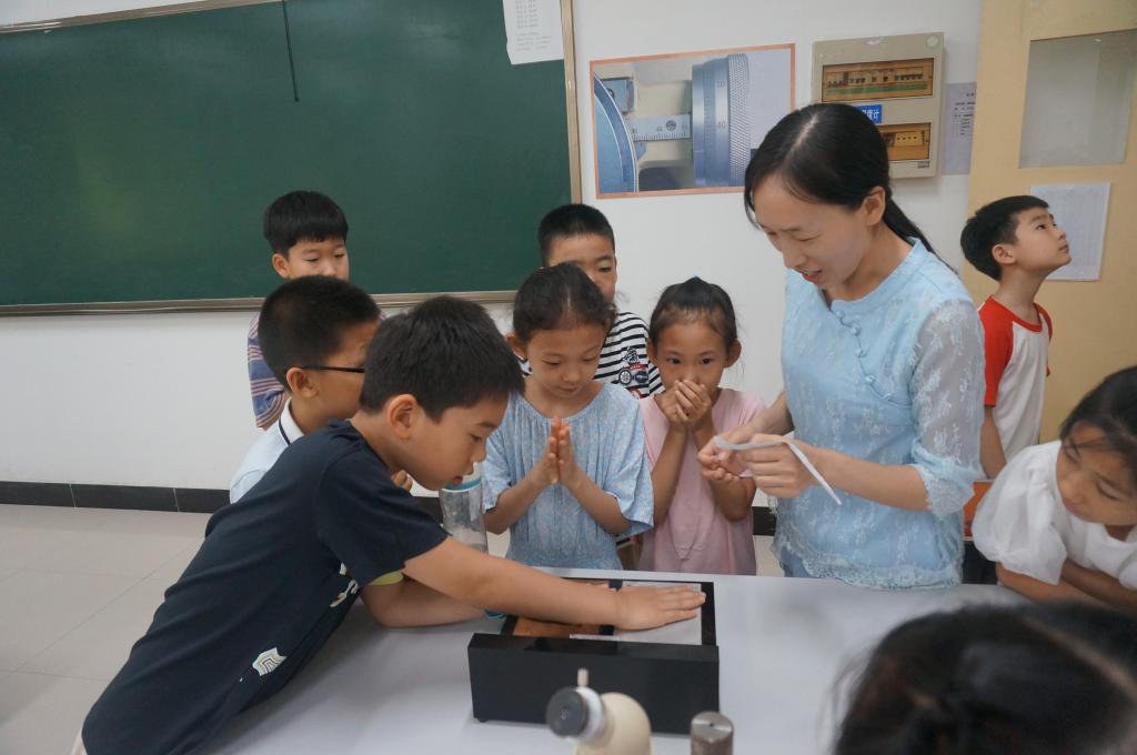随后,竹有章、赵云芳、李育新、雷玉明、赵丽华、刘兆梅、焦春红老师带领小同学们一起体验各种各样神奇的物理现象:用显微镜观察微小物体、茹科夫斯基转椅的秘密,用三棱镜对光进行合成与分解等。在互动体验环节中,小朋友们摩拳擦掌,感受“鱼洗”中激起水花,亲手感受棉花糖的制作过程,观察树叶的微观模样,小朋友好奇心被充分激发,在老师的带领下,感受到了电磁炮的威力,光也能发电,闪电也能制造出来,用激光也能偷听、金属也会自己动、控制放电的辉光球等。整个过程中,孩子们专心聆听,踊跃参与,气氛活跃,激发了对科学的探索精神。