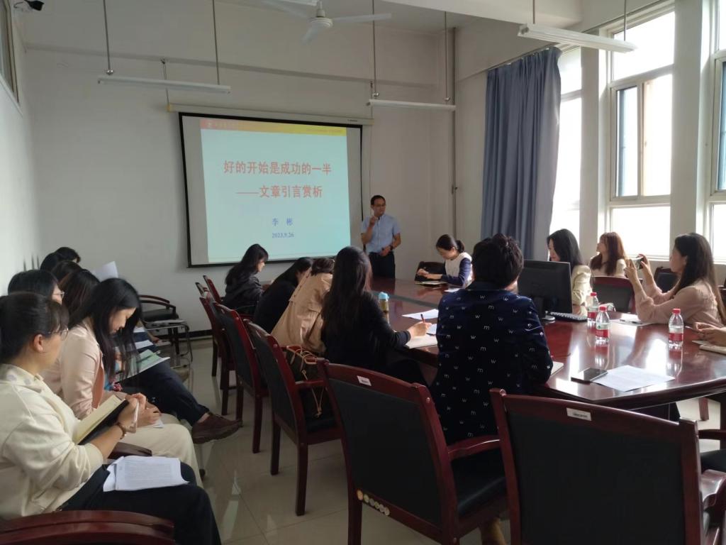 主任助理屈雯首先向各位老师介绍了李彬教授的科研经历。随后,李彬教授以《好的开始是成功的一半——文章引言赏析》为题,从何为引言、与摘要的区别、引言的要素构成、引言赏析四个方面作了专题讲座。提出引言是对文章的高度浓缩,在文献阅读时应重点关注,提取对自己有用的信息。并从内容与结构两个维度分析了摘要与引言的不同。在谈到引言内容时,重点讲解了研究背景、研究问题、问题重要性、研究内容概括、创新式贡献等构成要素。
