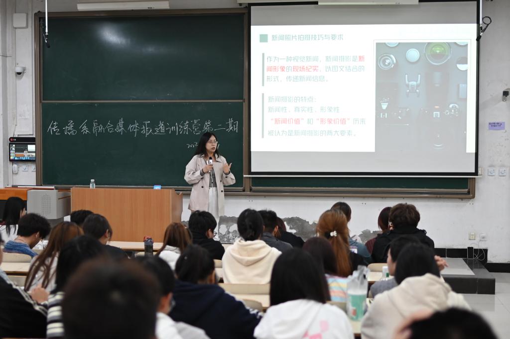 郭晨雪老师以“新闻照片拍摄技巧与要求”为主题,向同学们进行了新闻摄影相关培训。郭老师结合同学们的日常新闻摄影作品,从拍摄角度、摄影构图、拍摄时机三方面,重点对会议新闻拍摄和活动新闻拍摄进行了深入讲解。郭老师希望同学们做好新闻摄影前的准备工作,勤练技能,在拍摄中做到不慌不乱,游刃有余。