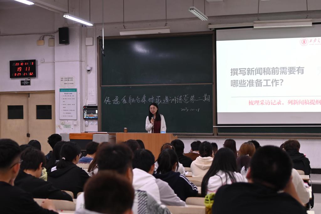石晓霞老师以“校园新闻稿写作技巧”为主题,向同学们进行了新闻稿写作技能培训。石老师首先带领同学们拆解了消息报道的基本结构,对消息各部分的撰写注意事项进行了强调。随后结合同学们的校园宣传实践具体案例,重点对校园新闻的会议类稿件、活动类稿件和讲座类稿件进行了详细讲解。石老师鼓励同学们用心沉淀,大胆实践,不断提升专业技能。