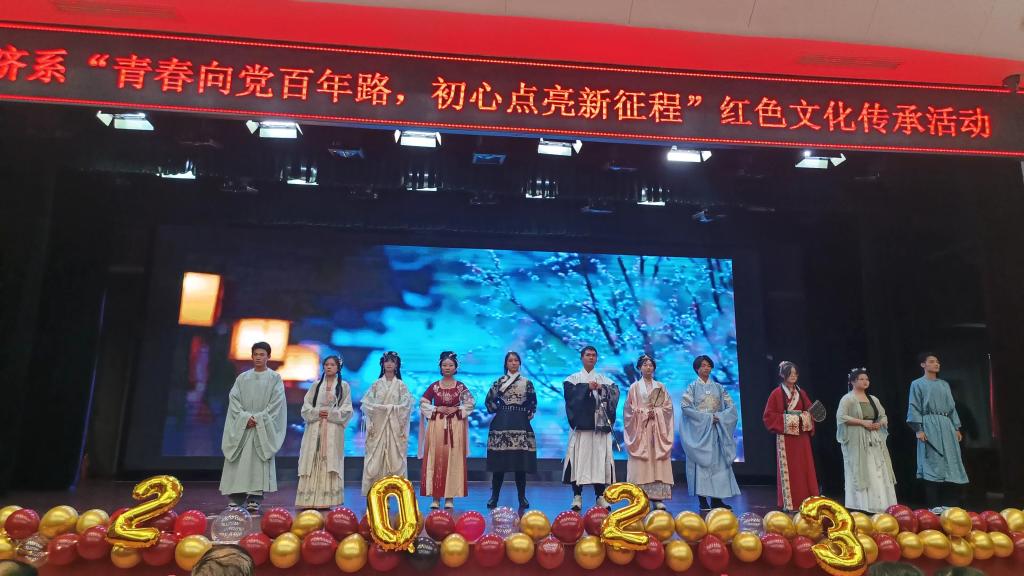 本次红色文化传承活动分为“立潮头·乘既往壮志”“击千浪·耀我辈豪情”“凌云志·聚追梦星火”三个篇章,以“青春之名,红色筑梦”微党课拉开序幕。经济系学生党支部杜奕博带来的微党课《为什么有淄博烧烤现象?》不仅从经济学原理解析淄博烧烤的成功,更从深层次剖析其背后“政通人合”的国泰民安和照进二十一世纪的文化胜利,体现了中国共产党人“为中国人民谋幸福,为中华民族谋复兴”的初心和使命。通过经济系支部党员梁月棋《赓续英雄之志,续写时代华章》、聂亚楠《试飞员》、陈逸杰《吾将吾心向吾党》、赵祎昶《“七一勋章”获得者--魏德友》、郗雨菲儿《开国第一名女将军--李贞》、石向前《戍边英雄陈祥榕》等微党课演讲,声情并茂地讲述着一个个感人至深的红色故事,让同学们近距离了解革命先辈艰苦奋斗、不怕牺牲、保卫家乡的光辉历史,立志传承红色基因,赓续红色血脉,自觉将爱国主义精神铭记于心、践之于行,珍惜当今来之不易的和平,接续未来砥砺奋进的新征程。话剧表演《战火中的大学生》更是让观众深刻感受到了大学生拳拳爱国之情。为致敬先辈对这伟大盛世的无私奉献,合唱《如愿》续写世间美好如约而至,愿我所愿,愿你所念,皆能如愿,引导同学们时刻肩负起振兴中华的时代重任。由邹奕飞带来的《小河淌水1952》使传统文化结合红色基因融入血脉,让红色精神迸发无穷力量,而活动的最后以充满时代大爱的《觉醒年代》朗诵出中华民族儿女不屈的呐喊,展现出同学们对为建设社会主义现代化强国而努力奋斗的决心。