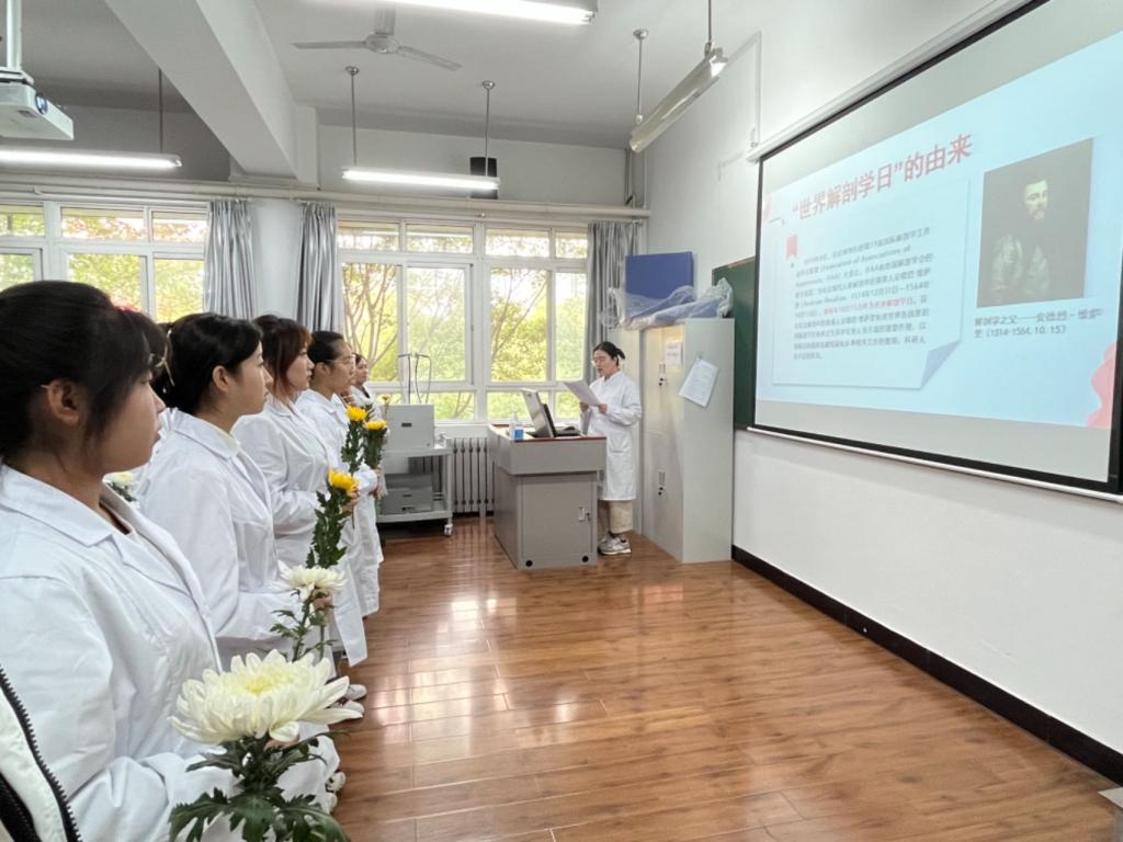 活动开始,护理系实验教师赵晓文带领大家了解“世界解剖学日”的由来。世界解剖学日的设立旨在纪念近代解剖学奠基人——安德烈·维萨里,使世界各国意识到解剖学在培养卫生科学专业人员方面的重要作用,以缓解目前遗体捐献短缺和从事相关工作的教师、科研人员不足的状况,现将每年10月15日作为世界解剖学日。随后,全体师生“听关小瑛的故事,感受大爱精神”。南丁格尔奖得主关小瑛的奉献精神值得每一个人学习,她一生为“护”,身后为“师”,将自己的遗体捐献给了医院。通过关小瑛的故事,希望同学们在面对大体老师时,要给予足够的尊重和爱戴,将这份爱化作救死扶伤的仁心,传递给患者,以实际行动回馈无言良师,为医学事业作出自己的贡献。接着由学生代表熊飞同学带领全体师生宣读解剖学誓词,“无言良师,授吾医理;敬若先贤,临如活体;正心恭行,追深辨细;德彰术精,修成大医”,一声声誓言掷地有声,蕴含着每位同学对大体老师的感恩与尊重。活动最后,全体师生缅怀大体老师,对大体老师鞠躬致意,并进行了献花仪式。