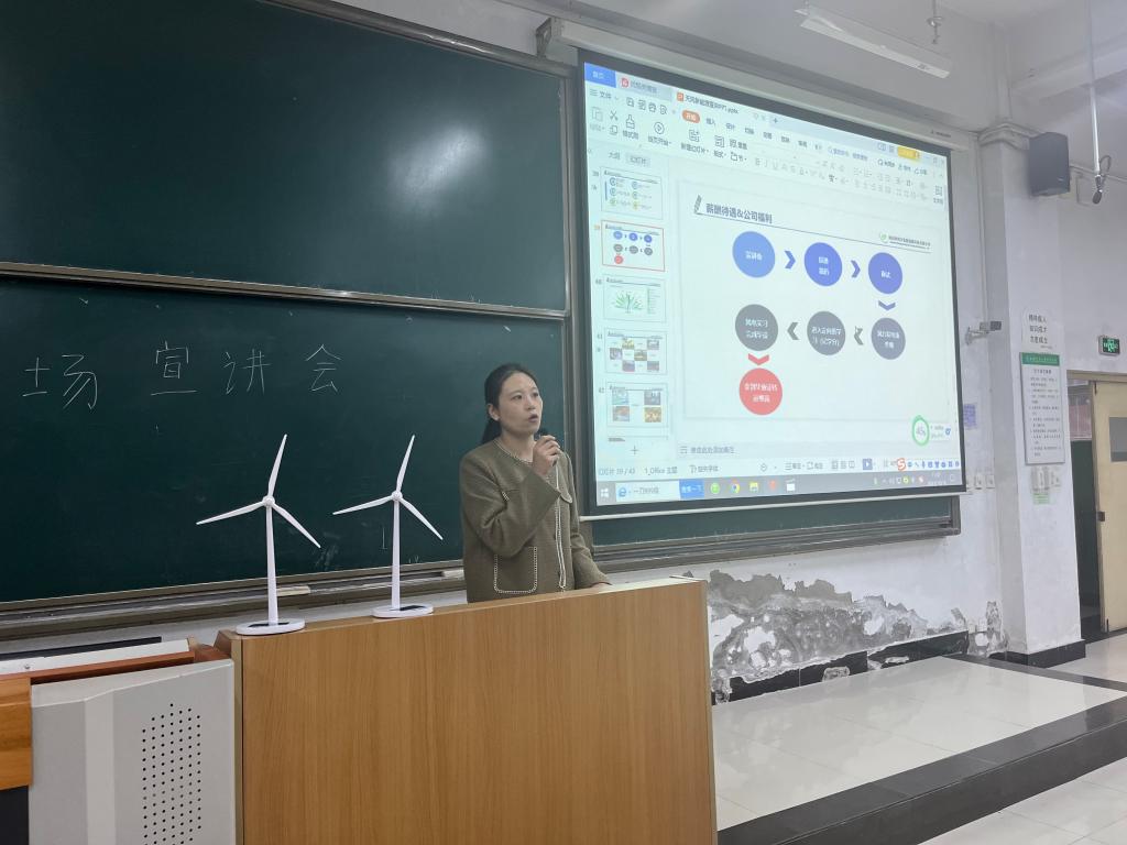 王丽丽对天风(无锡)新能源有限公司的到来表示热烈欢迎,她介绍了天风(无锡)新能源有限公司的基本情况及往届生在该单位的现状,并简单介绍了机械系、电信系学生的基本情况,最后王老师希望在座的同学们能珍惜就业机会,踊跃投递简历,实现尽早、尽快,充分且高质量就业。