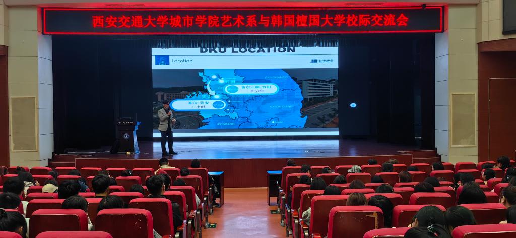 随后,曹处长在教二报告厅向艺术系学子介绍檀国大学艺术学相关专业的办学特色、留学申请条件、在校留学生情况等,并与学生展开亲切轻松的交流互动。本次交流访问为艺术系海外访学、出国深造感兴趣的师生提供了宝贵的信息,同时也开拓了师生们的国际视野。