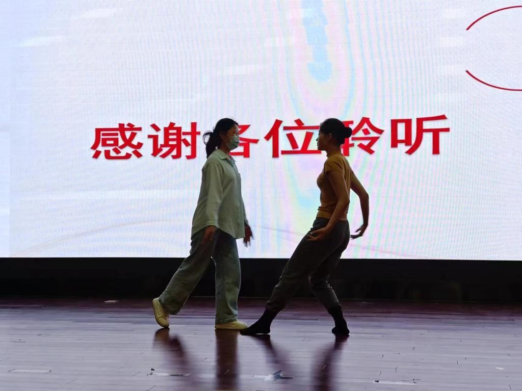 陈金晶带领同学们从“觉察”“授新课”“接触即兴”和“分享”四个部分进行了接触即兴舞蹈的实践体验,西安音乐学院舞蹈学院2021级舞蹈编导专业李阳、董姿含两位同学引导带领现场师生一起体验了接触即兴的舞蹈形式。讲座中,陈金晶老师为大家分享舞蹈艺术的魅力,讲述舞蹈背后的故事,并现场展示一些经典的舞蹈动作。陈金晶用音乐现场即兴伴奏,城院学生与西安音乐学院学生进行了接触即兴的演示,独特的讲座方式点燃了同学们的互动热情。