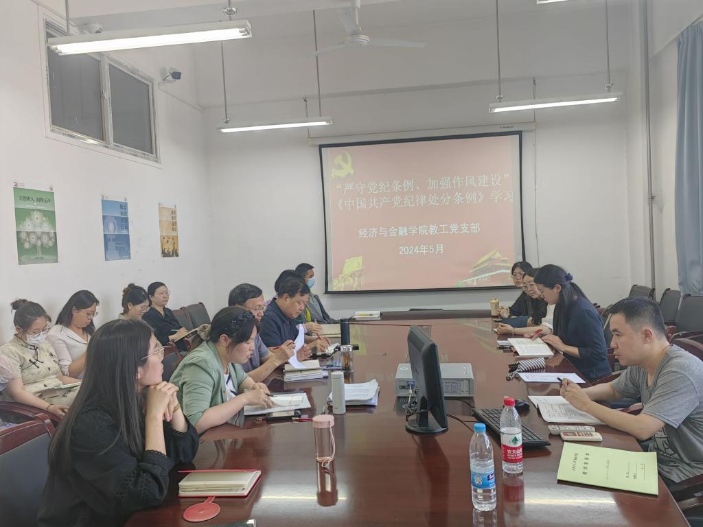 为深入学习贯彻习近平总书记关于党纪学习教育的重要讲话和重要指示精神,加强党的纪律建设,增强党员的政治觉悟和纪律意识。经济与金融学院教工党支部于5月16日开展“守住教师师德师风底线”主题党课学习活动,组织全体教职工党员深入学习新修订的《中国共产党纪律处分条例》(以下简称《条例》),会议由党支部书记白丹主持。