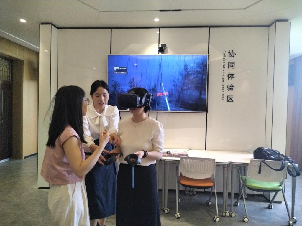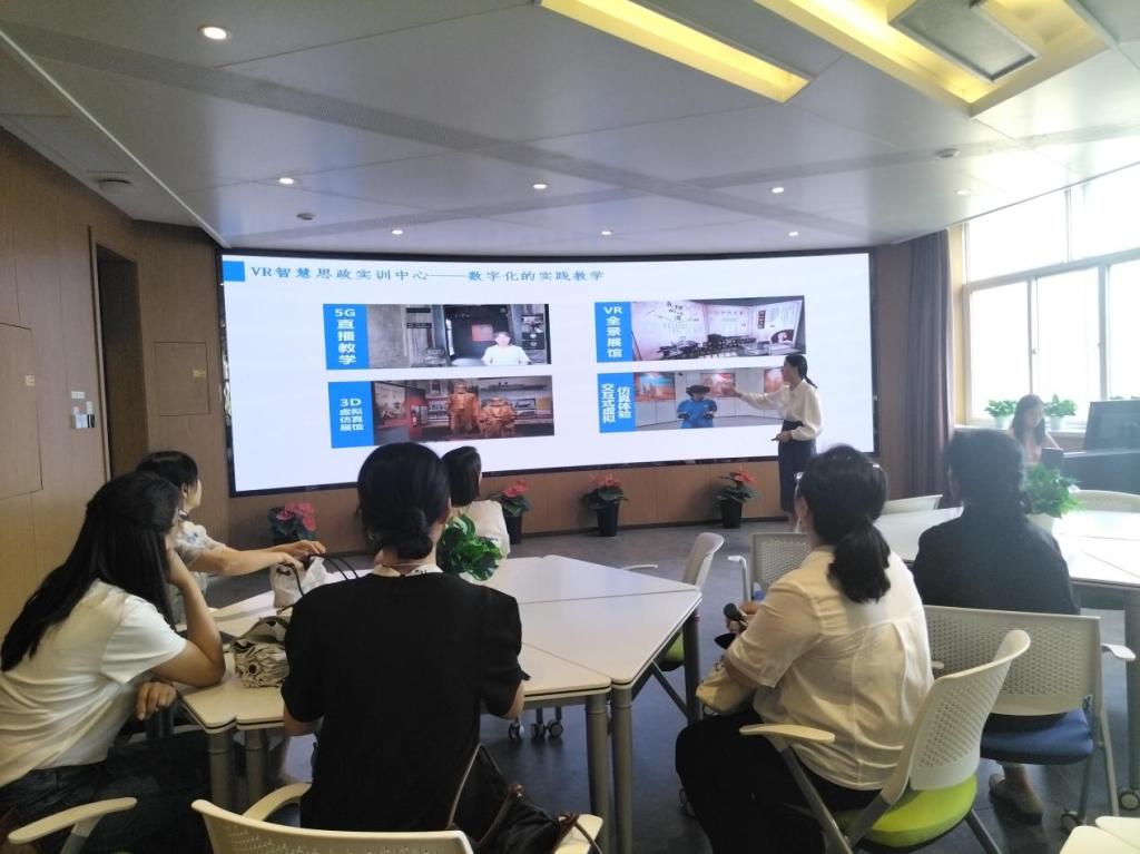 在实训中心相关老师的陪同下,调研组老师们参观了智慧思政实训基地——“学马研习·践创空间”,对智慧思政实训基地的整体建设思路、功能定位及技术支持等情况进行了细致了解,同时切身感受了VR与3D红色资源建设效果。