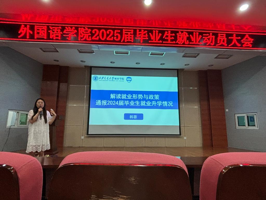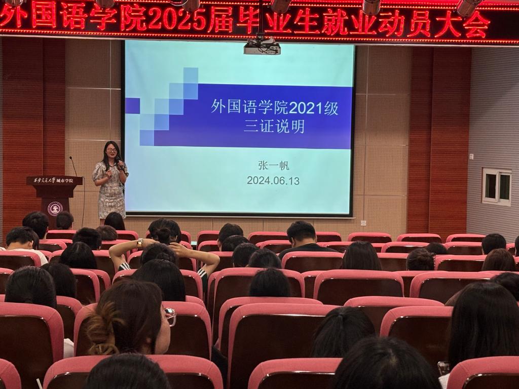 为做好2025届毕业生就业工作,了解当前就业形势、政策,更好地明确职业方向,切实提升就业竞争力,外国语学院于6月21日在F100召开2025届毕业生就业工作动员会。出席本次会议的有英语系副主任袁长普、张一帆,学生工作负责人吴丹,团工委书记韩蓉及2021级全体学生。