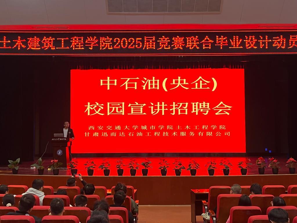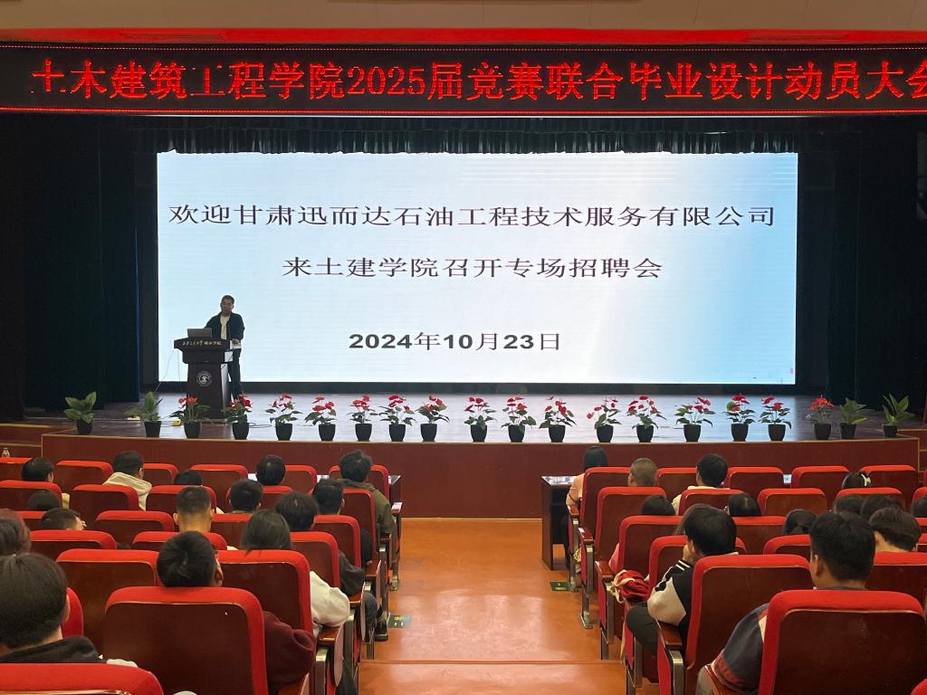 甘肃讯而达石油工程服务有限公司总经理杜龙山、招聘经理张晓东、学工负责人李辉、毕业班辅导员杨洋、康璐及全体土建学院毕业生参加了本次招聘会。