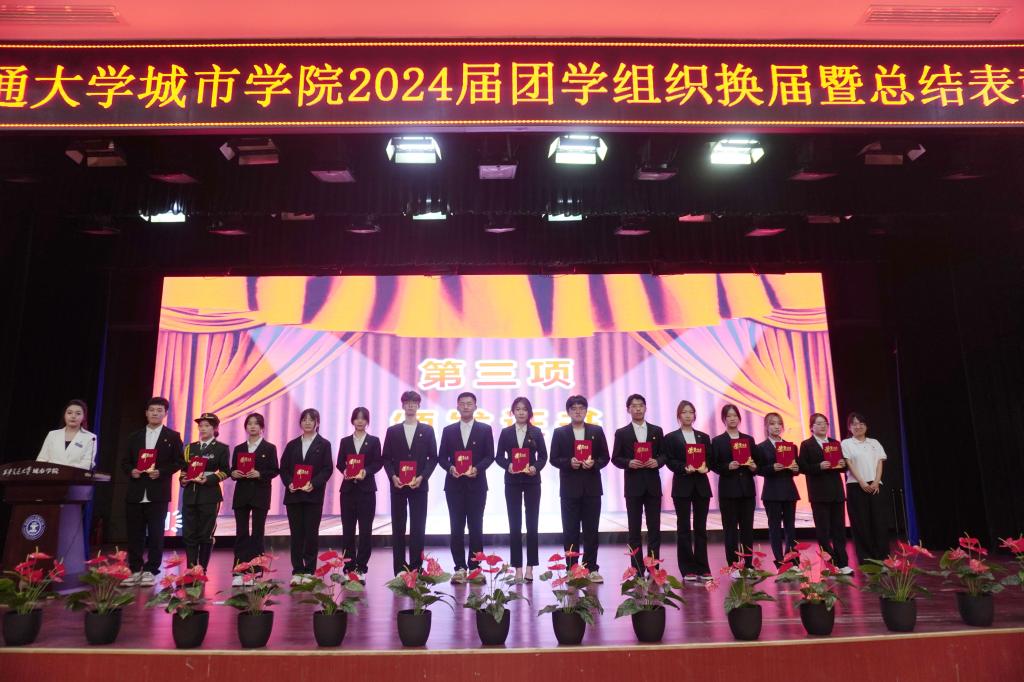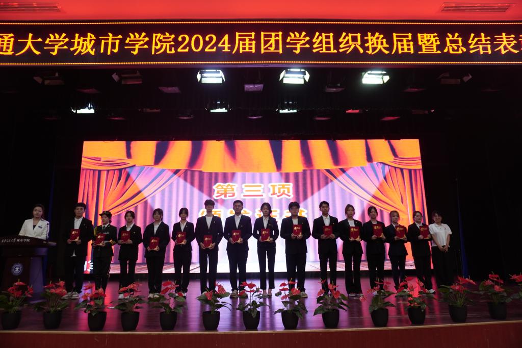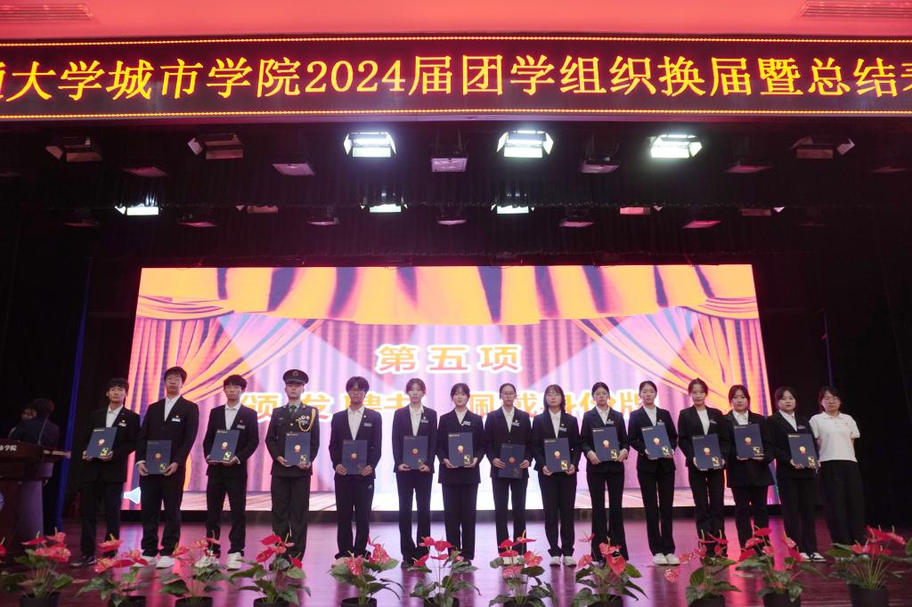 大会在共唱中国共产主义青年团团歌中拉开帷幕。校团委高荣宣读《2024届校级团学组织换届表彰决定》并向各位优秀的学生干部颁发荣誉证书。随后,校团委徐兰君宣读2024届学生干部及社团干部任命名单,为他们颁发聘书并佩戴学生干部身份牌,各二级学院团工委书记分别为二级学院学生干部代表颁发聘书。