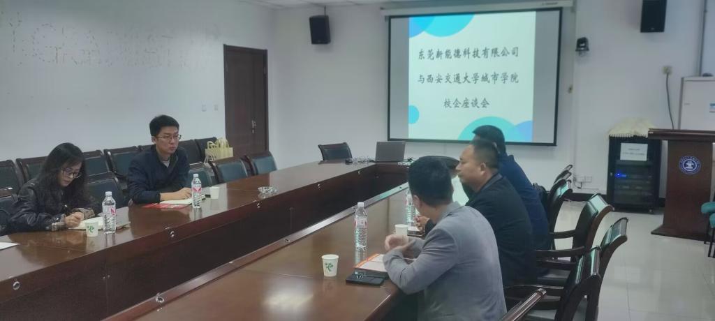 东莞新能德科技有限公司的代表详细介绍了公司的基本概况、业务范围、企业文化以及在新能源领域的发展战略和技术创新成果。公司代表表示,随着企业的快速发展,对各类专业人才的需求日益增加,学校在相关专业领域有着丰富的教学资源和优秀的学生群体,希望通过此次座谈会,能够建立长期稳定的合作关系。吴昊翔介绍了学校的发展历程、学科建设、师资力量以及人才培养模式等方面的情况,他强调,学校注重实践教学和学生综合素质培养的教育理念,并表达了希望与企业深入合作的强烈意愿。最后,双方就人才培养、实习就业等多个议题展开了深入讨论,并初步达成合作意向。