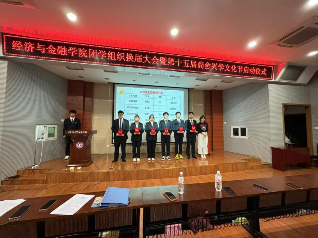 经济与金融学院于10月30日在F100举行经济与金融学院第十五届团学组织换届大会与第十五届“尚舍兴学”文化节启动仪式。经济与金融学院院长助理廉宇婷、团工委书记蒋美一帆、学工办杨静怡、张进参加活动。本次大会由支部学生团员王蒙恩主持。