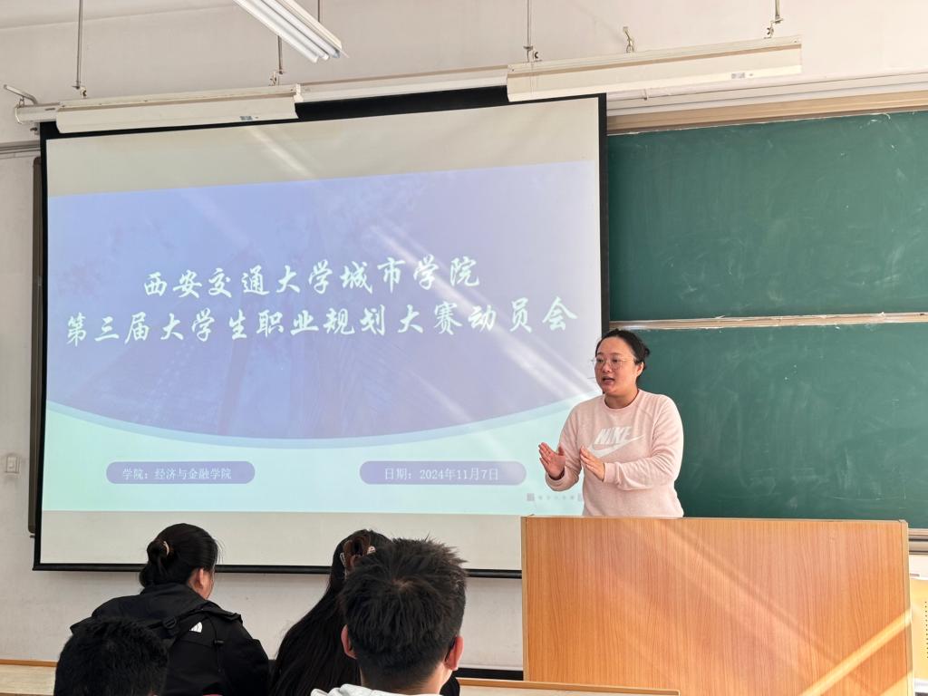 11月6日,经济与金融学院召开“第三届大学生职业规划大赛”动员会,廉宇婷结合专业学科内容,着重从树立生涯发展理念、合理设定职业目标、市场岗位需求等方面出发,就成长赛道和就业赛道作出说明,动员大家积极参赛,树立正确的成长成才观和就业择业观,科学合理规划学业与职业发展。鼓励同学们要以饱满的热情和坚定的信念迎接挑战。