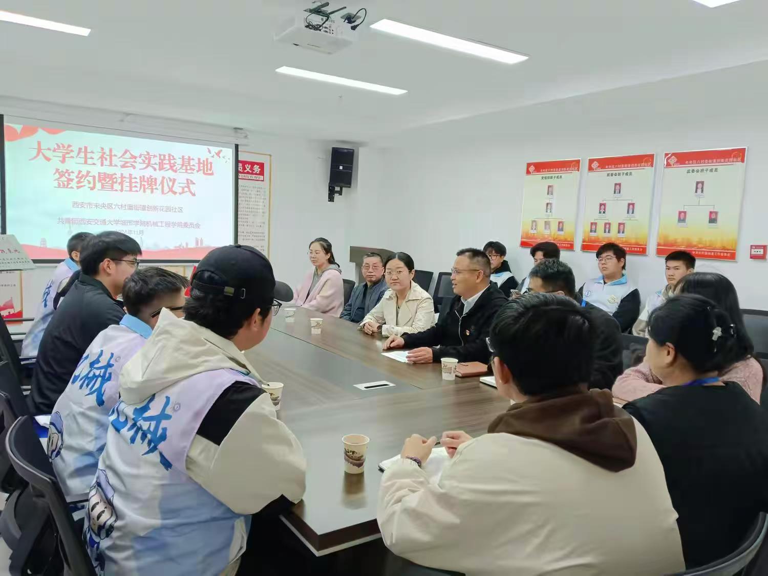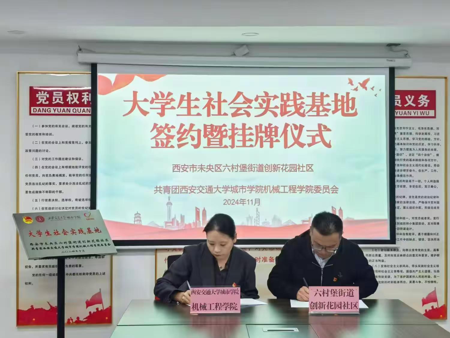 为深化社会实践育人工作,推动新时代青年学子社会实践与志愿服务活动融入基层社会治理,引领大学生在社会实践中受教育、长才干、做贡献。11月5日,机械工程学院大学生社会实践创新创业实践基地签约暨挂牌仪式在西安市未央区六村堡街道创新花园社区举行。未央区六村堡街道党建办副主任、团工委副书记赵玮、六村堡街道创新花园社区党支部书记江正兵、威尼斯7798cc机械工程学院院长助理兼学生党支部书记王丽丽、团学工作负责人张哲源以及社区“小星星”志愿服务队志愿者、机械工程学院团学组织代表参加活动。