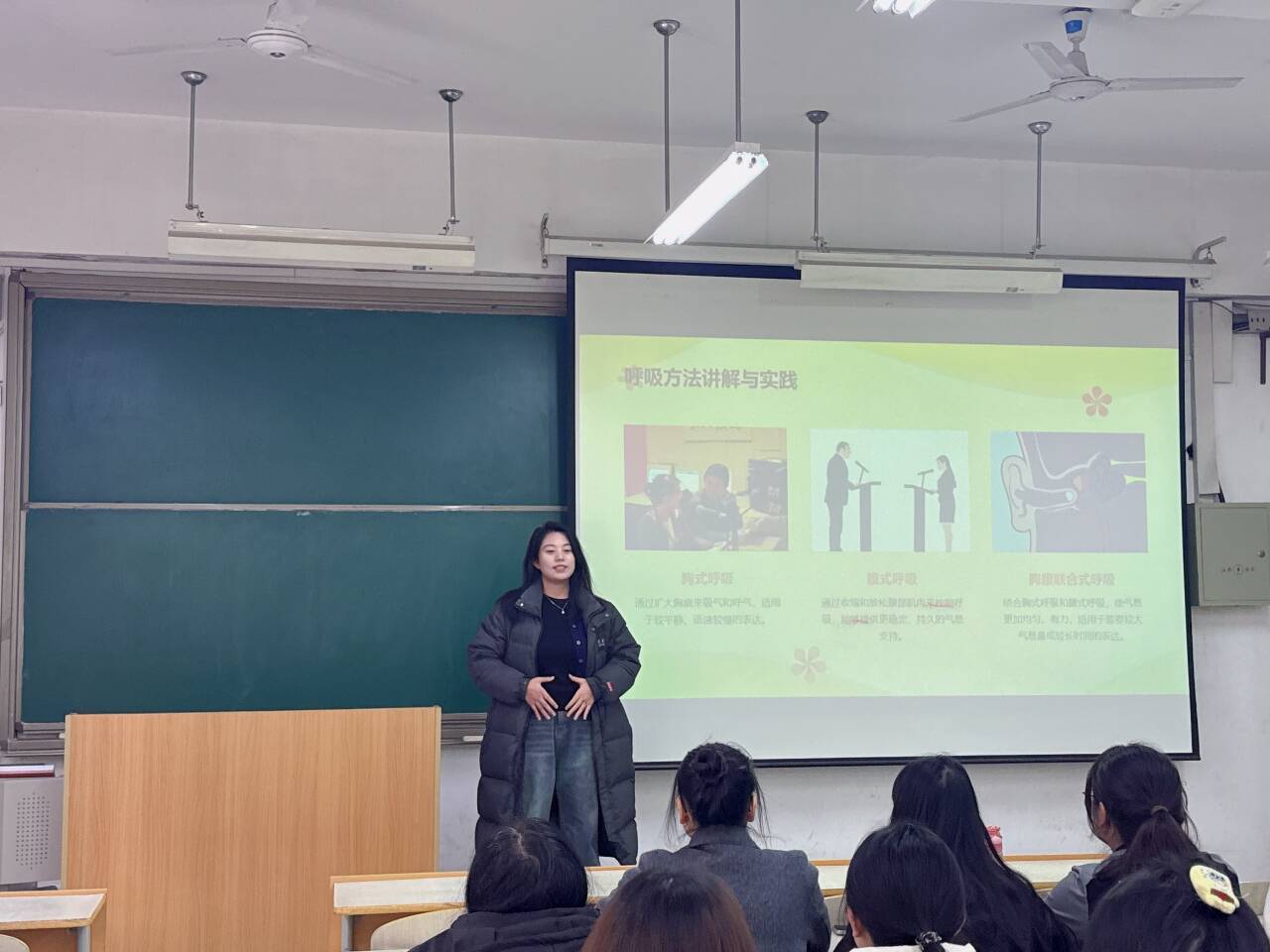 刘慈同学首先为大家讲解了播音主持的基本功,她强调,播音语言的特点要简单、清晰、表达能力强,播音发声要求吐字准确、清晰、洪亮、富有感染力。她用胸腹式联合呼吸法原理,为同学们进行了专业示范。她用充满专业性、趣味性的讲课方式,将党员们带入到文字情境中,让大家切身感受到声音的力量与魅力。