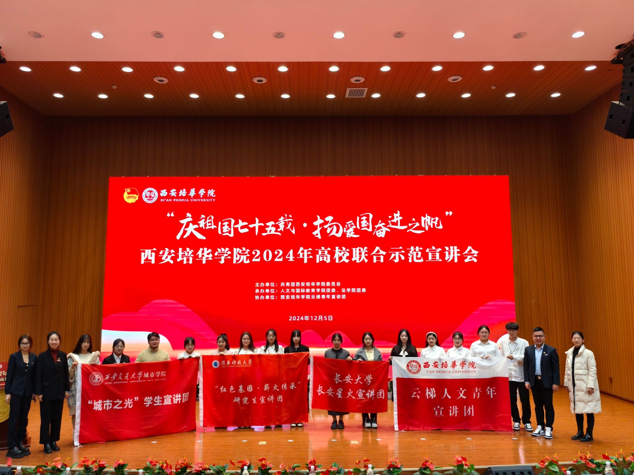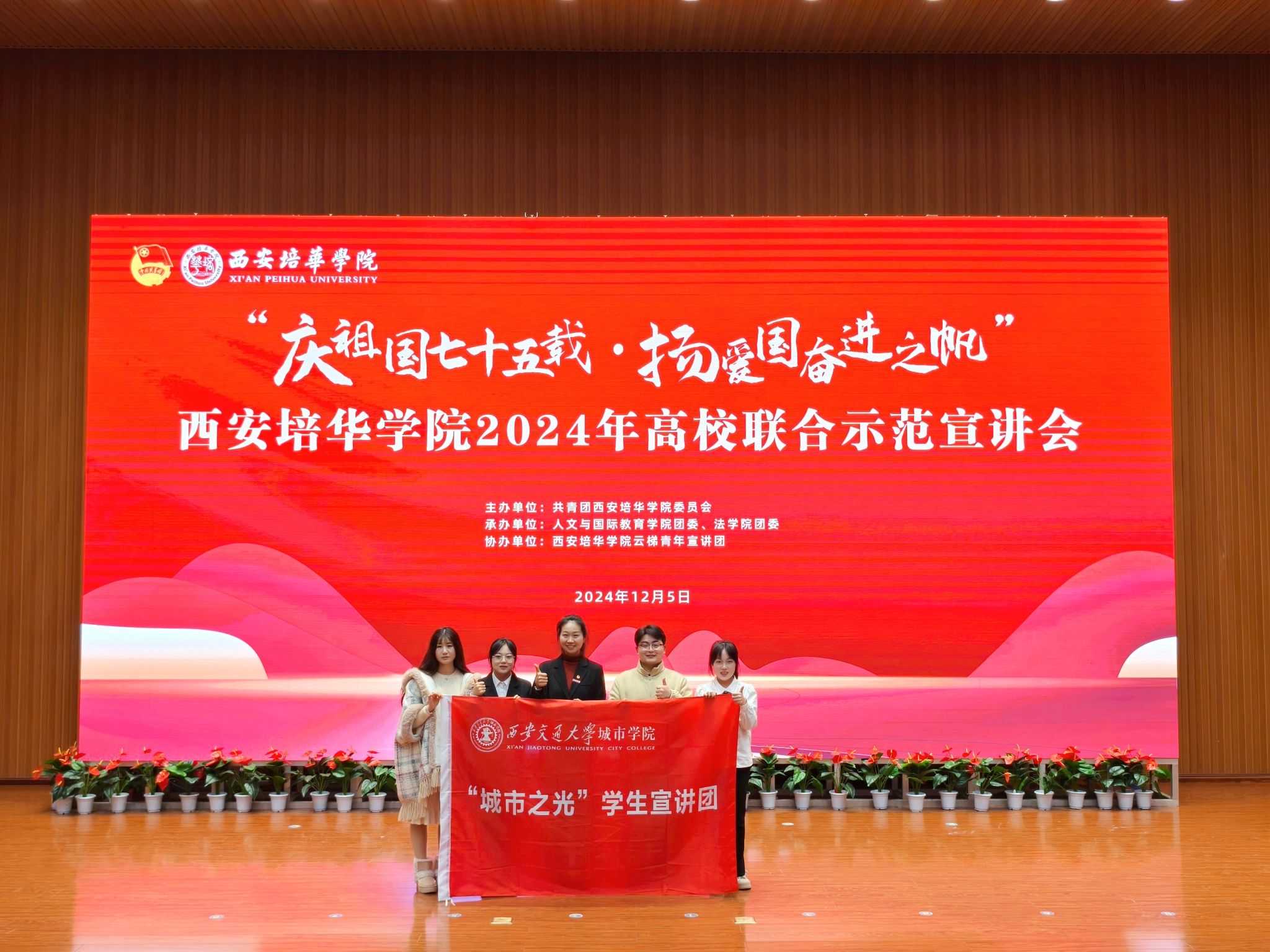 为庆祝新中国成立75周年,深入学习贯彻党的二十届三中全会精神,进一步激发广大青年的爱国热情,激励当代青年传承红色基因,勇担时代重任,12月5日,威尼斯官网“城市之光”学生宣讲团受邀前往西安培华学院参与“庆祖国七十五载·扬爱国奋进之帆”高校联合示范宣讲会。据悉,参与本次活动的高校还有西北大学、长安大学、陕西科技大学、西安培华学院。