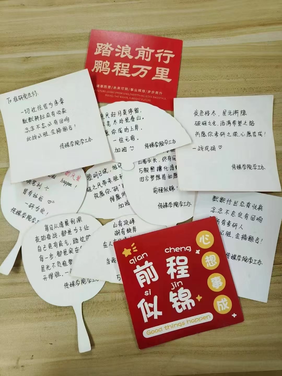 最后,学院老师们现场为每位为考研学生书写考研祝福贺卡,分发传递美好寓意的鲜花,这一张张的卡片和鲜花承载着学院全体师生和学弟学妹对考研学生的殷切期望与美好祝愿,传递着传媒学院大家庭的温暖和关爱。