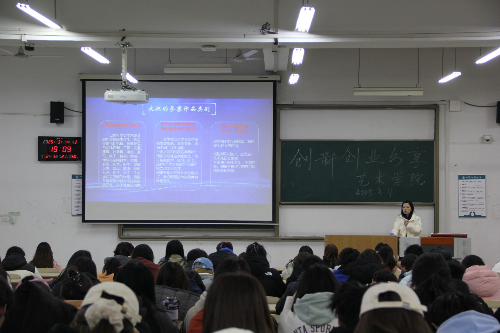 为进一步激发艺术学院学生创新创业的热情,提高大学生创新、创意、创造、创业的意识和能力,增加同学们对创新创业的兴趣和实践能力,展示艺术领域的创新成果,艺术学院于3月4日晚在E400举办“创新创业”大赛分享会,参加本次会议的有艺术学院创新创业负责人张小欢、艺术学院创新创业团队成员及大一同学。