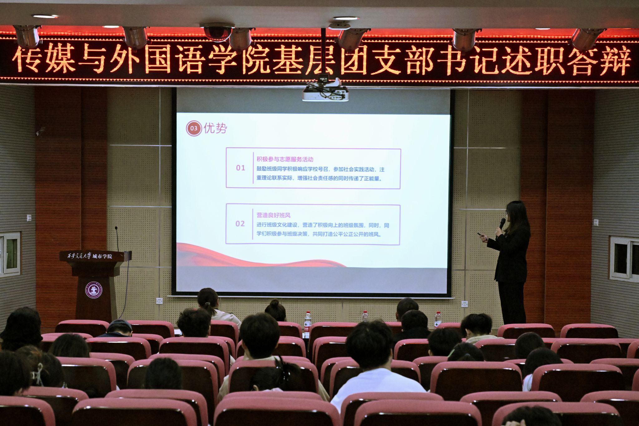 为引导广大团员和青年学生坚守初心,进一步加强基层团组织规范化建设,不断完善基层团组织考核制度,激发组织活力,传媒与外国语学院于4月8日中午在F100开展基层团支部书记述职答辩。传媒与外国语学院院长助理刘敏涛、团工委书记陈欣、辅导员杨月、任瑾及学生代表参加本次答辩活动。