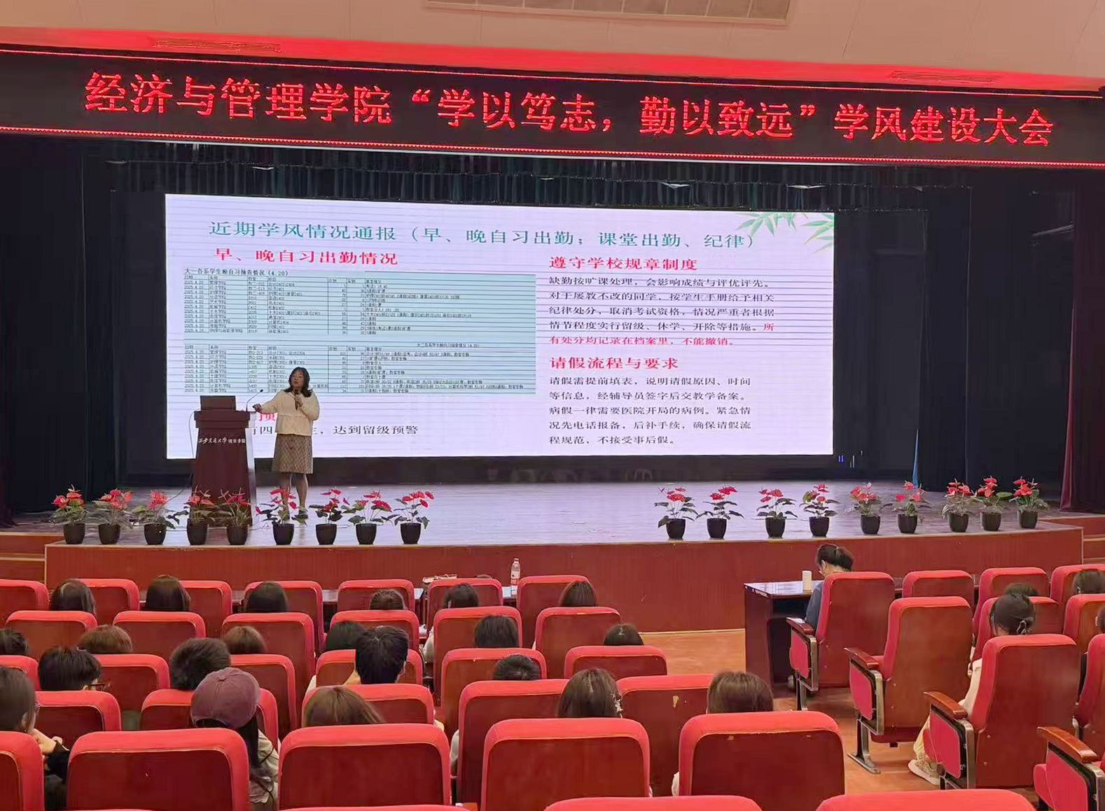 近日,学院在教二报告厅召开“学以笃志,勤以致远”学风建设专题会议,经济与管理学院副院长白丹、院长助理廉宇婷及教师代表参会。会议指出,学风建设是一项系统性工程,需全院上下协同发力。会上白丹明确了以“思想引领、制度保障、活动促进” 为核心的工作思路,提出通过加强课堂纪律管理、完善学业预警机制、开展学业指导活动等具体举措,全面提升学风建设水平。将学风建设融入日常教学工作,引导学生树立正确的学习态度,激发学习动力。