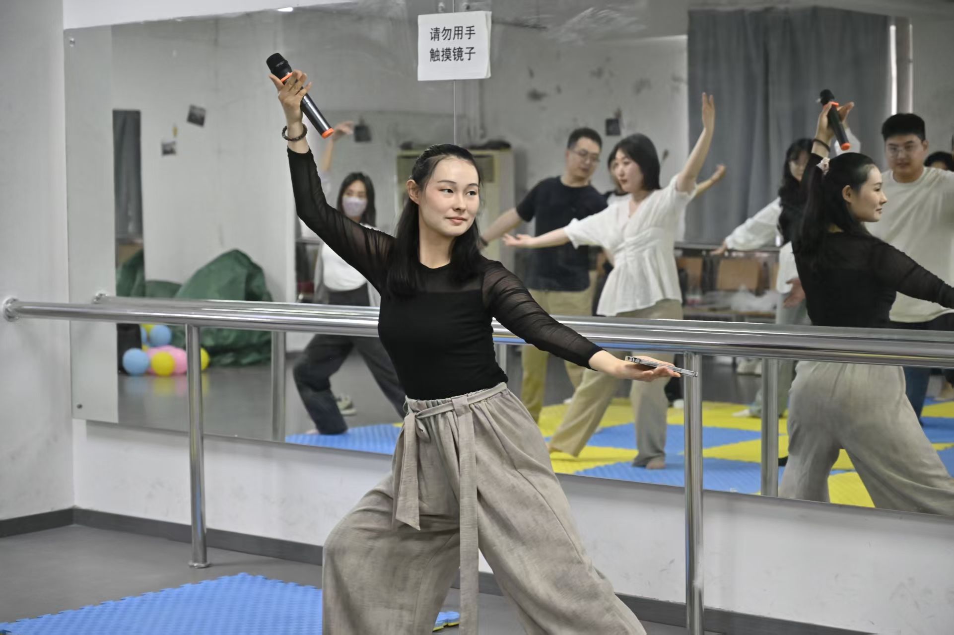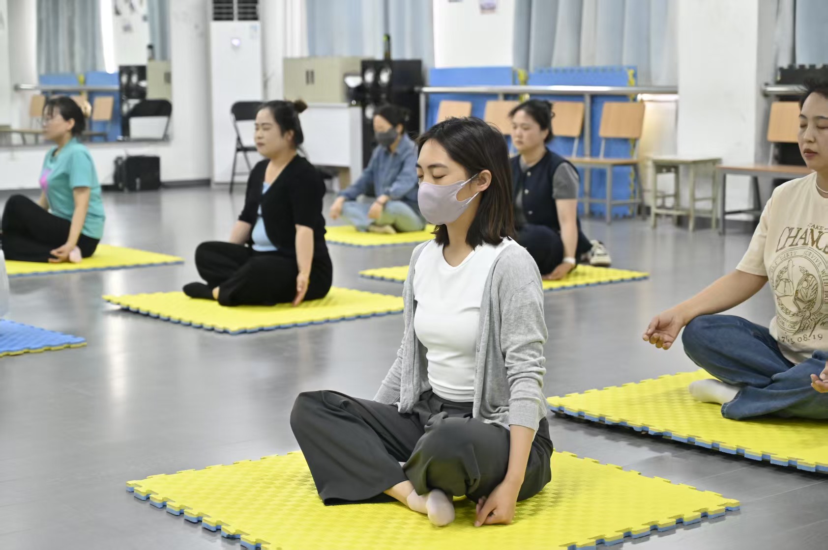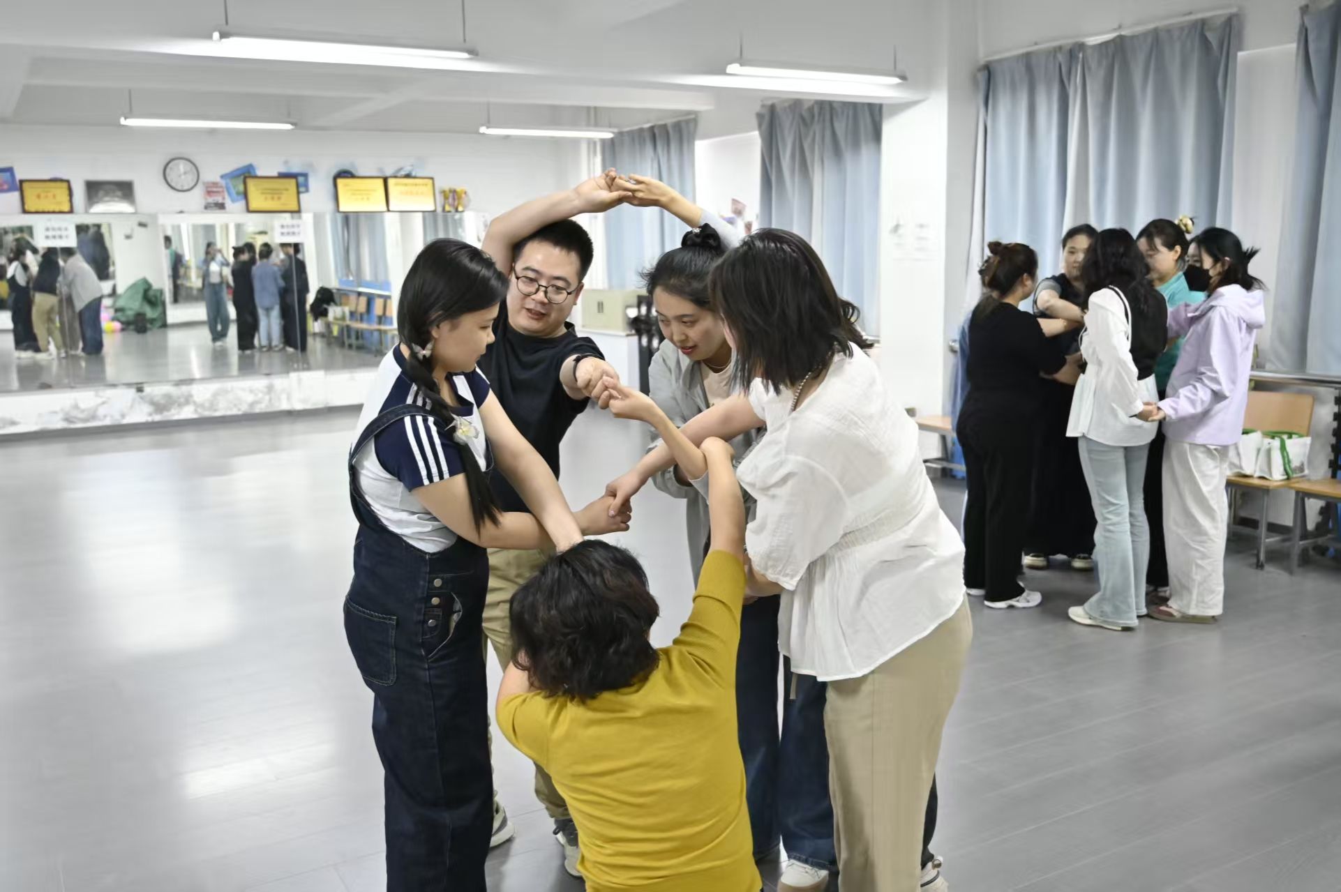 金老师通过呼吸冥想、即兴律动、互动共舞和自主发挥等环节,引导辅导员们放下日常压力,在自由舒展的肢体表达中觉察情绪、连接自我。活动现场,老师们跟随音乐节奏,通过非言语的肢体动作交流与传递情感,体验身心合一的状态。