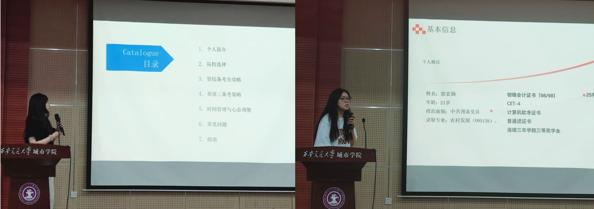经验分享环节中,2021级成功考取研究生的孙潇萌同学分享了自己的备考经验,她着重讲述了自己在备考过程中的时间管理、心态调整方法,面对学习压力和挫折时如何保持积极乐观,以及如何在长时间的备考中维持良好的学习状态。常宏扬同学则从学习方法层面入手,分享了自己在不同科目上的独特学习技巧,比如英语单词的记忆方法、专业课知识点的梳理技巧等,还分享了自己在考研复试阶段的宝贵经验,包括如何准备复试、面试时的注意事项等。