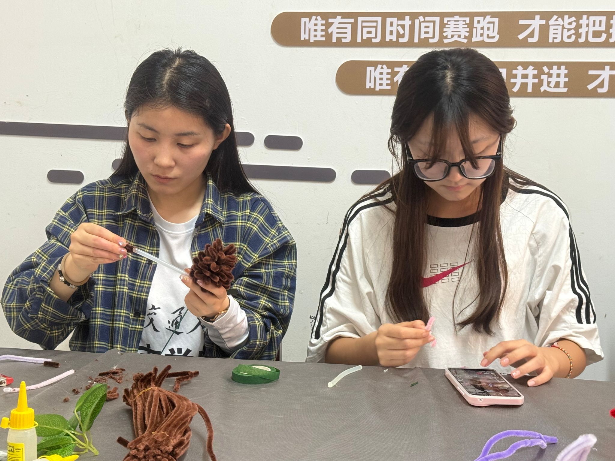 5月19日,在心育专员张进的指导下,在三号楼143开展了“扭出繁花、心灵绽放”扭扭棒手工制作。五颜六色的扭扭棒激发了同学们的创作热情,大家围坐在一起,时而专注地弯折、缠绕,时而热烈地交流探讨,现场气氛轻松愉悦。一根根普通的扭扭棒在同学们的巧手中变幻出各种精美的造型,在扭扭棒的创作过程中,同学们不仅体验到了手工艺术的无限乐趣,还在轻松愉快的氛围中有效缓解了学习生活的压力,更为珍贵的是,通过这次活动,同学们互相分享创作心得,增进了彼此的了解,建立了更深厚的友谊。
