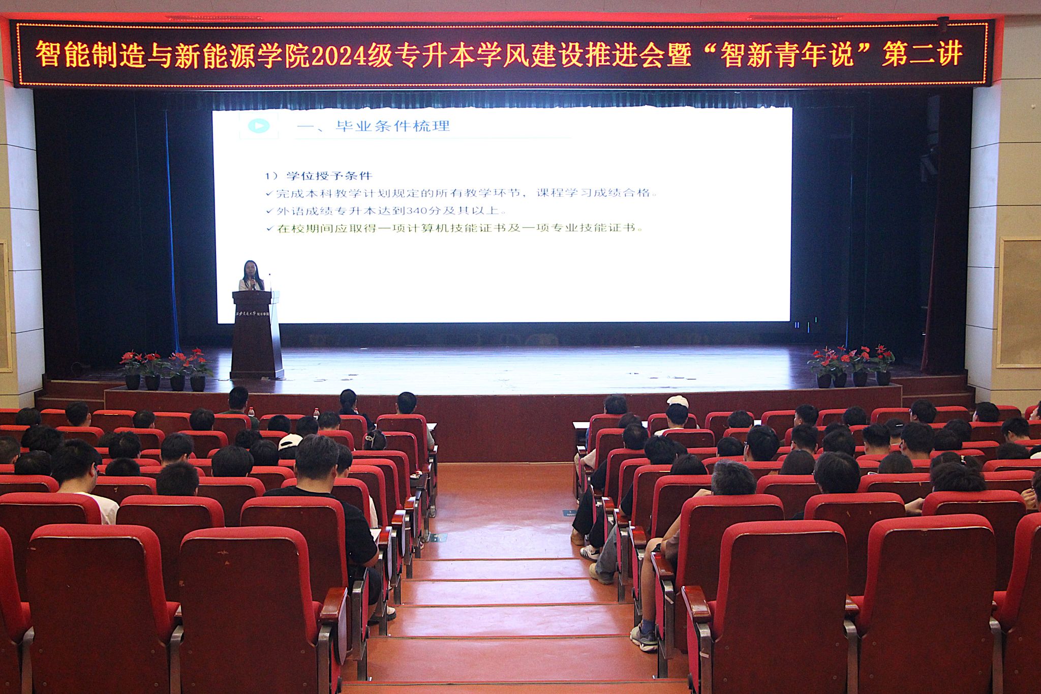 为构建智能制造与新能源学院学风建设常态化、持续化长效机制,同时解决专升本同学在学业、三证、考试等出现的急难愁盼的一系列问题。智能制造与新能源学院于6月13日在教二报告厅召开24级专升本学风建设推进会暨“智新青年说”第二讲。智能制造与新能源学院副院长竹有章、院长助理王丽丽、23级专升本优秀学生代表王晟淏及24级专升本全体同学参会。本次会议由24级专升本辅导员史晓薇主持。