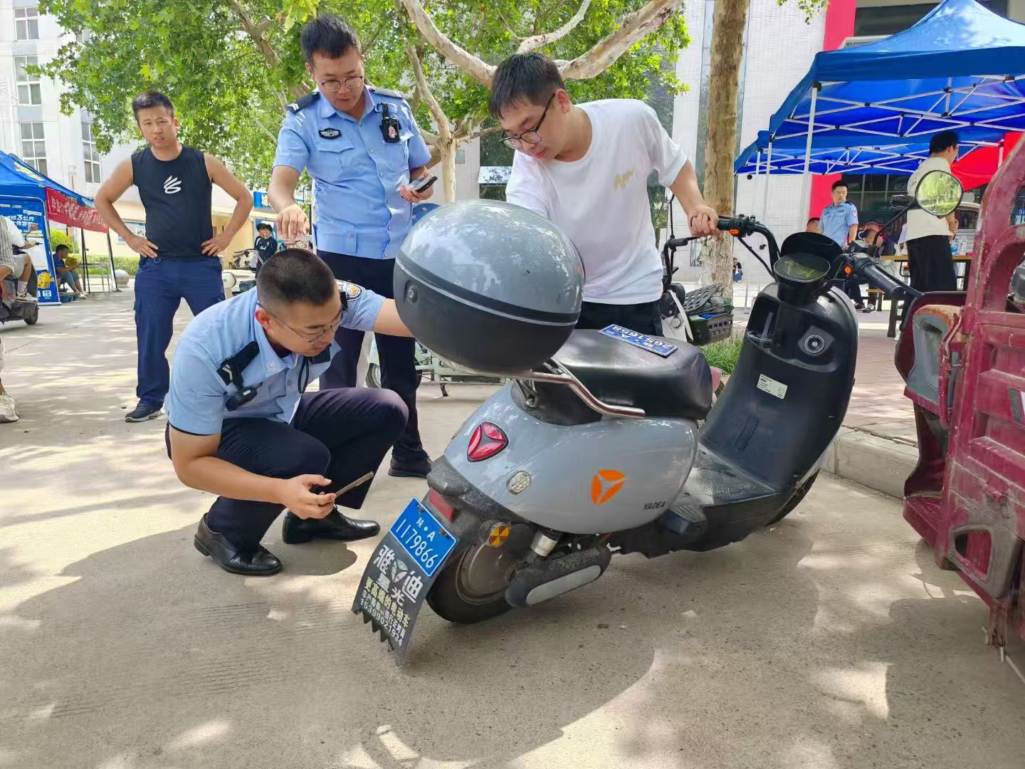 为严格落实西安市电动自行车新规,进一步规范校园电动自行车管理,6月20日,保卫处联合草滩中队民警在校园内开展驾管业务入校服务,现场办理电动自行车挂牌业务。