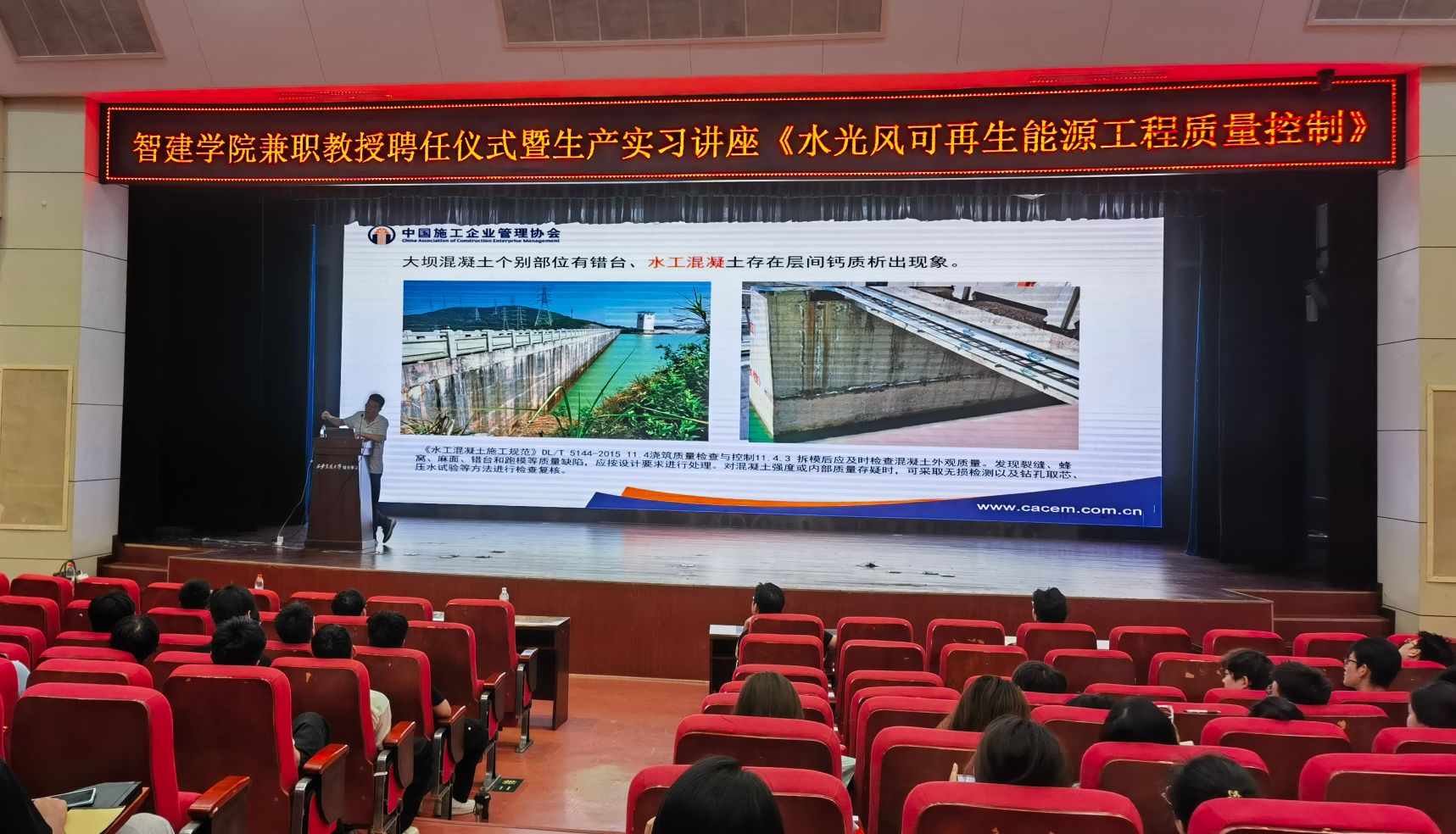 聘任仪式后,刘玮为全体师生做了“水光风再生能源工程质量控制”专题报告,结合陕西锦界电厂、±800kV特高压输电线路等工程案例,系统讲解了新能源项目建设中的土建工程关键技术要点和质量控制方法。讲座内容紧贴行业发展趋势,现场师生就BIM技术应用、绿色施工等话题展开热烈讨论。