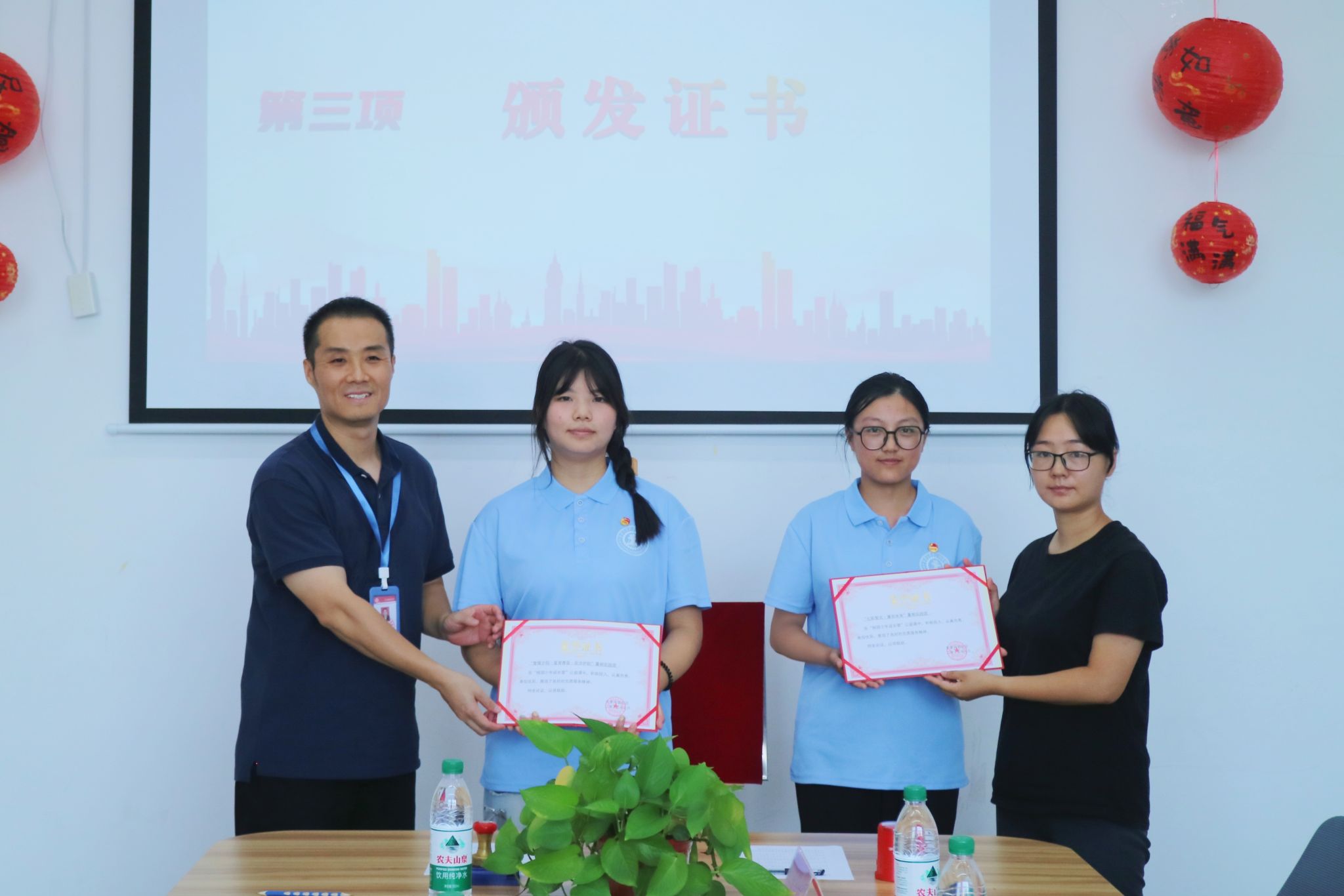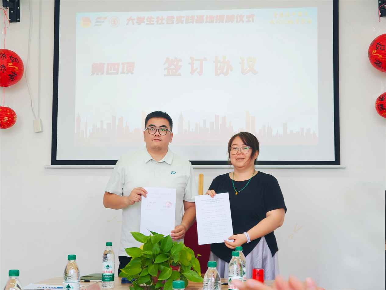 东晋桃园社区副主任张磊、代荣共同为两支社会实践团队颁发了荣誉证书,表彰其在社区服务中的突出贡献。在与会人员的共同见证下,韩娟娟与崔佳楠代表双方签署了共建合作协议。许大炜与韩娟娟共同为“大学生社会实践基地”揭牌。